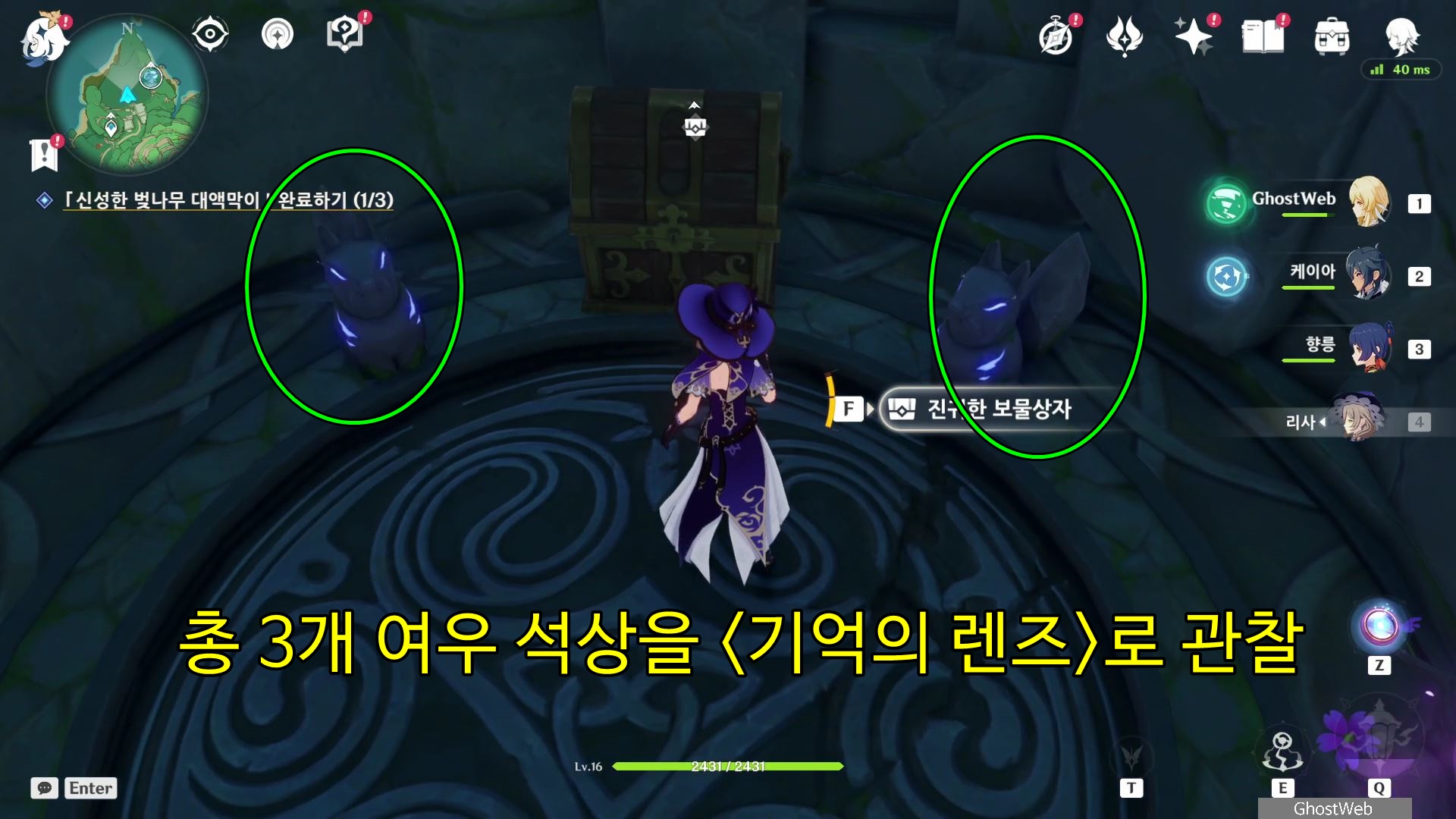 부서진 탑을 올라가 <번개 신의 눈동자>를 획득하고 아래로 내려가 보물상자를 획득하고 주위를 둘러보면 여우 석상(지호) 3개가 있는데, 각각의 여우 석상을 <기억의 렌즈>로 관찰하면 석상 뒤에 스위치 같은게 생성되며 3개의 스위치를 작동하면 지하로 갈 수 있는 통로가 개방돼요.