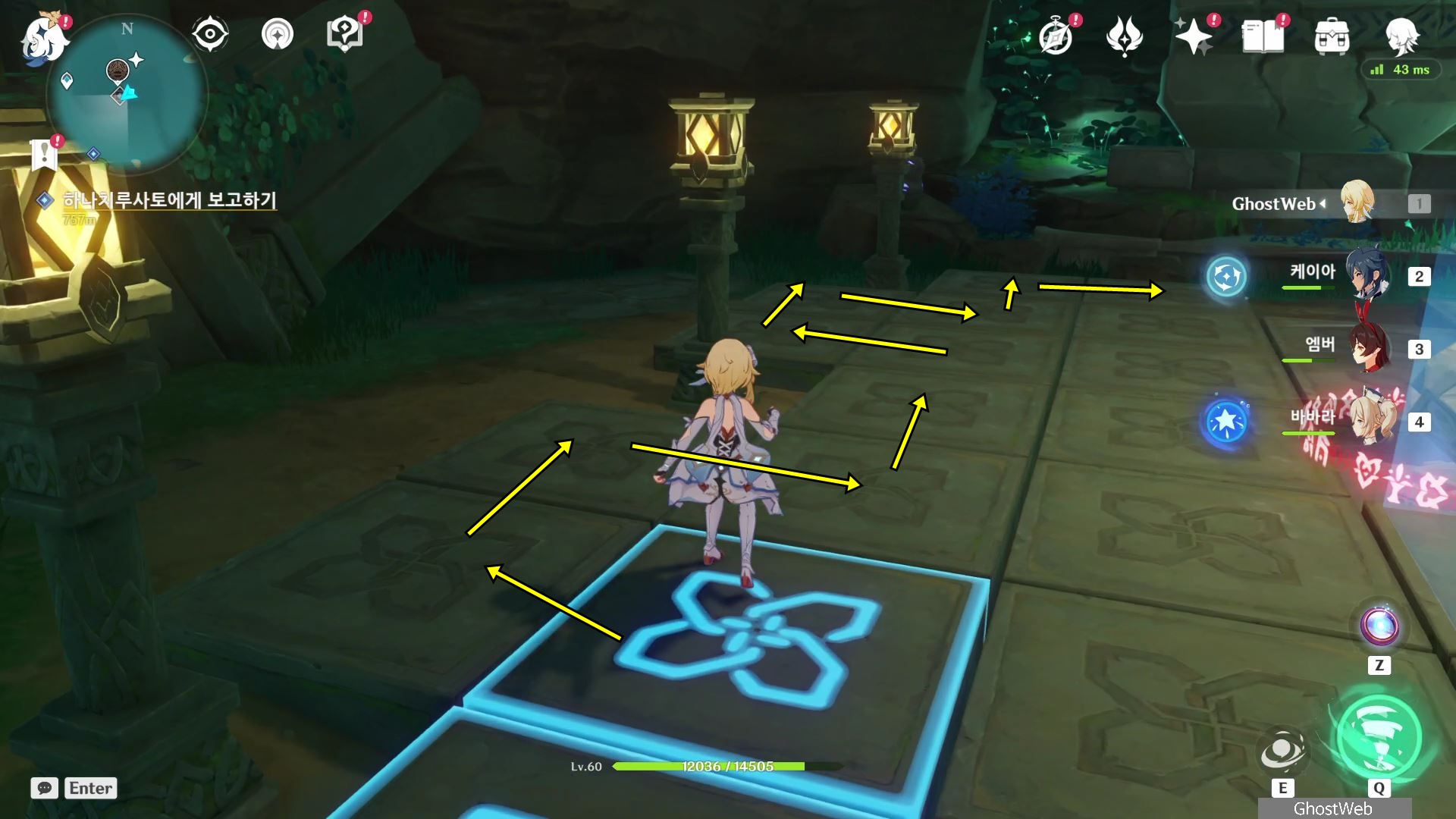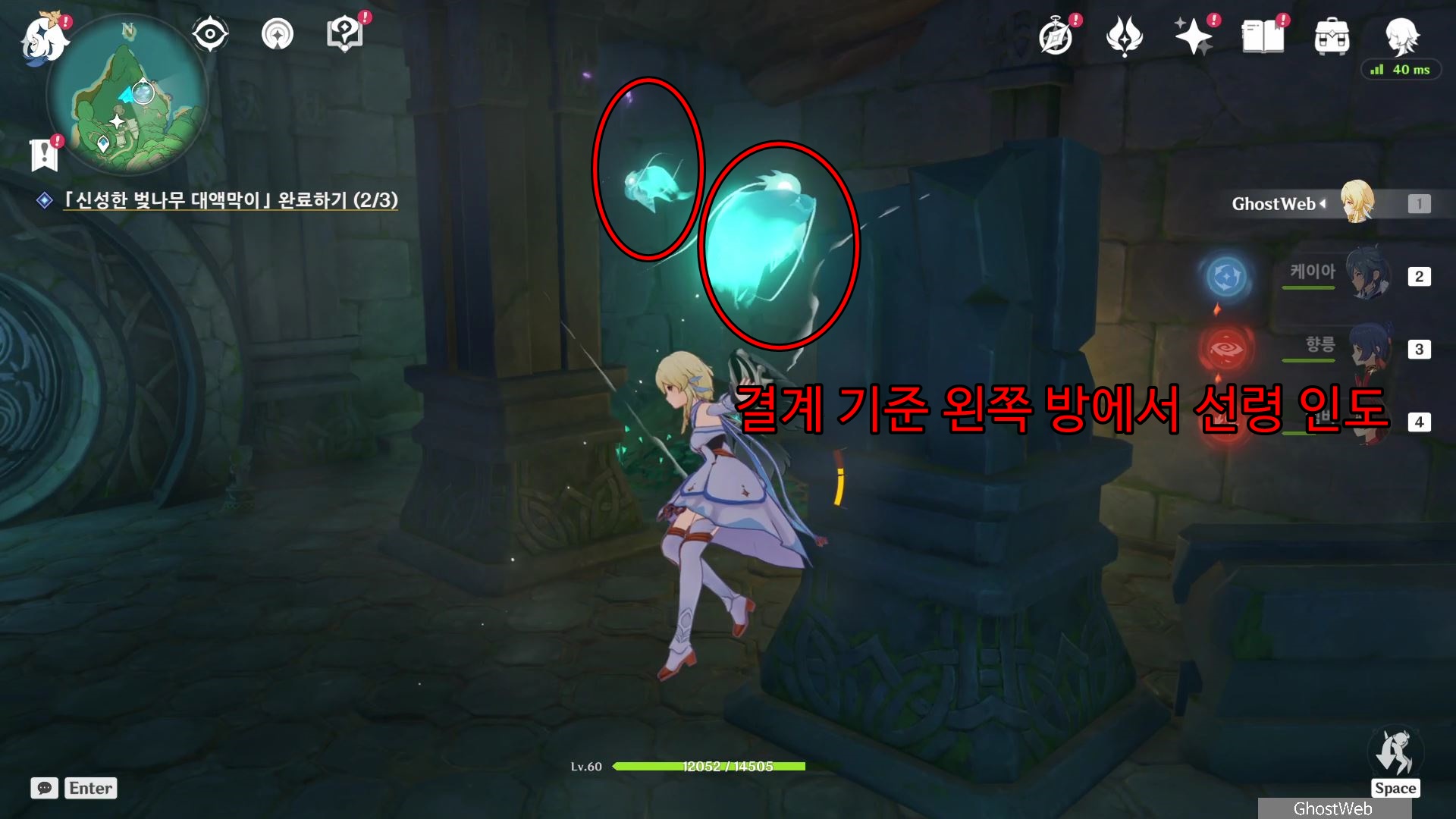 우선 왼쪽 방으로 가서 기믹 뒤 언덕 위에 있는 선령을 결계 오른쪽 방으로 인도하고 오른쪽 방에 기둥 위에 있는 선령 1마리도 인도하여 막힌 문을 개방하세요.