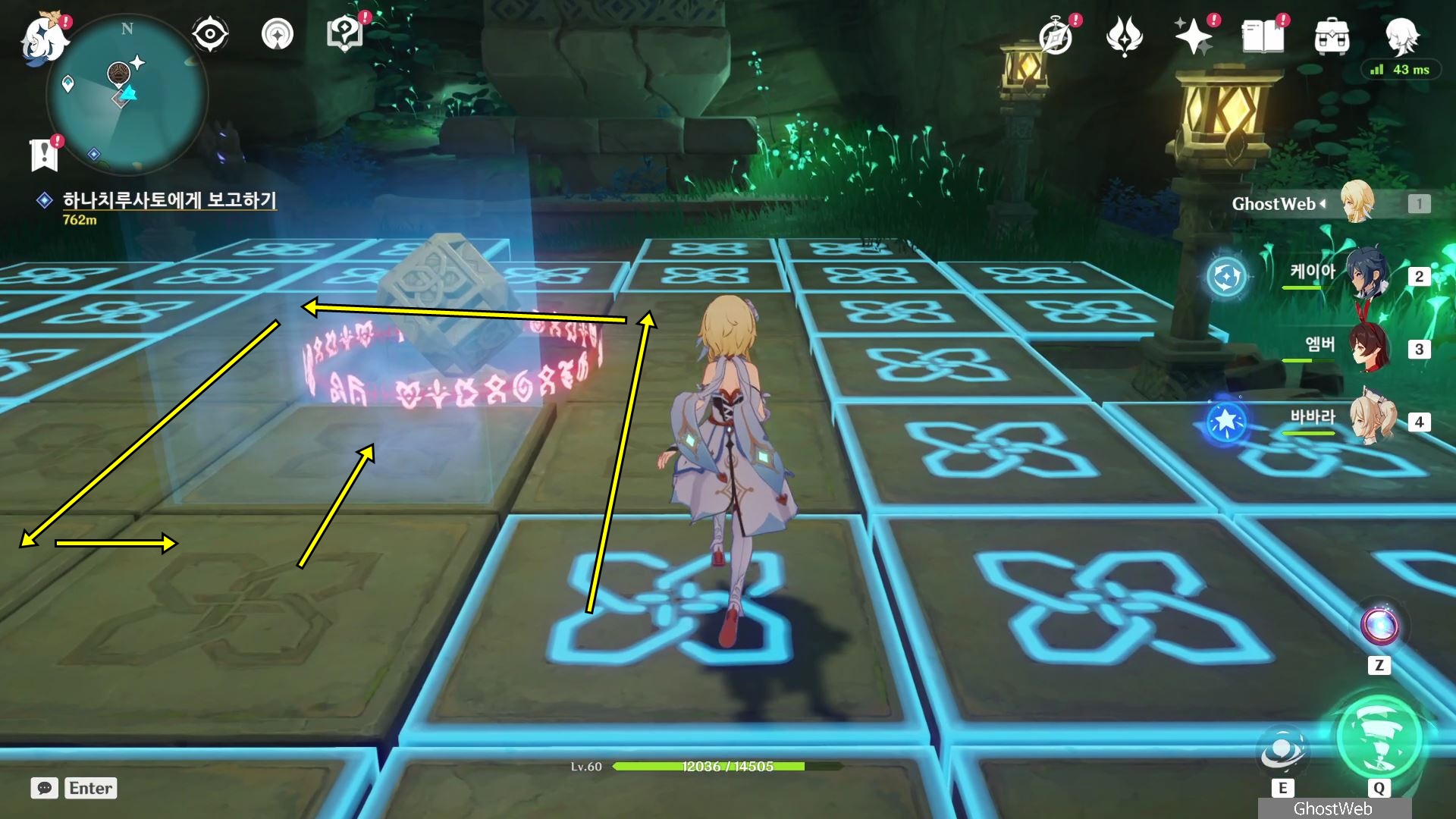 그리고 다시 왼쪽 방으로 가서 박스 기믹이 있는데, 박스를 공격하면 패턴에 맞게 주변 박스들도 같이 움직이는데, 3번 박스 2번 공격 후 1번 박스 2번(순서 : 3→3→1→1) 공격하면 기믹을 풀 수 있어요. (패턴 한 모서리에 있는 박스 공격 시 인접 한 박스 2개가 회전, 중앙 X, 예: 1번 공격 시 1번과 함께 인접한 2, 4번 동시 회전 / 모든 박스가 중앙 박스와 동일하게 문양이 같은 쪽을 바라보게 배치하면 됨)
