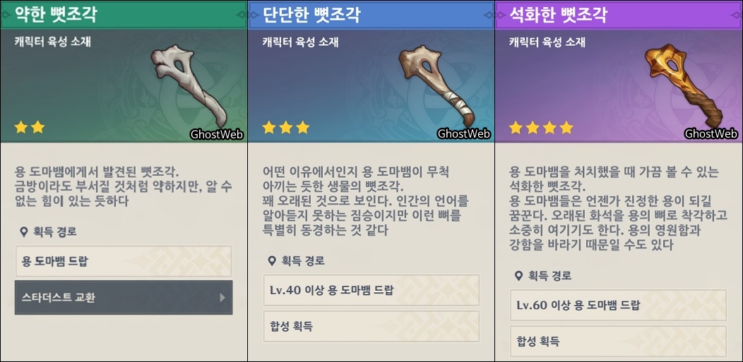 약한/단단한/석화한 뼛조각은 리월 지역에 있는 바위 용 도마뱀, 새끼 바위 용 도마뱀 처치를 통해서도 얻을 수 있으니 참고하세요.