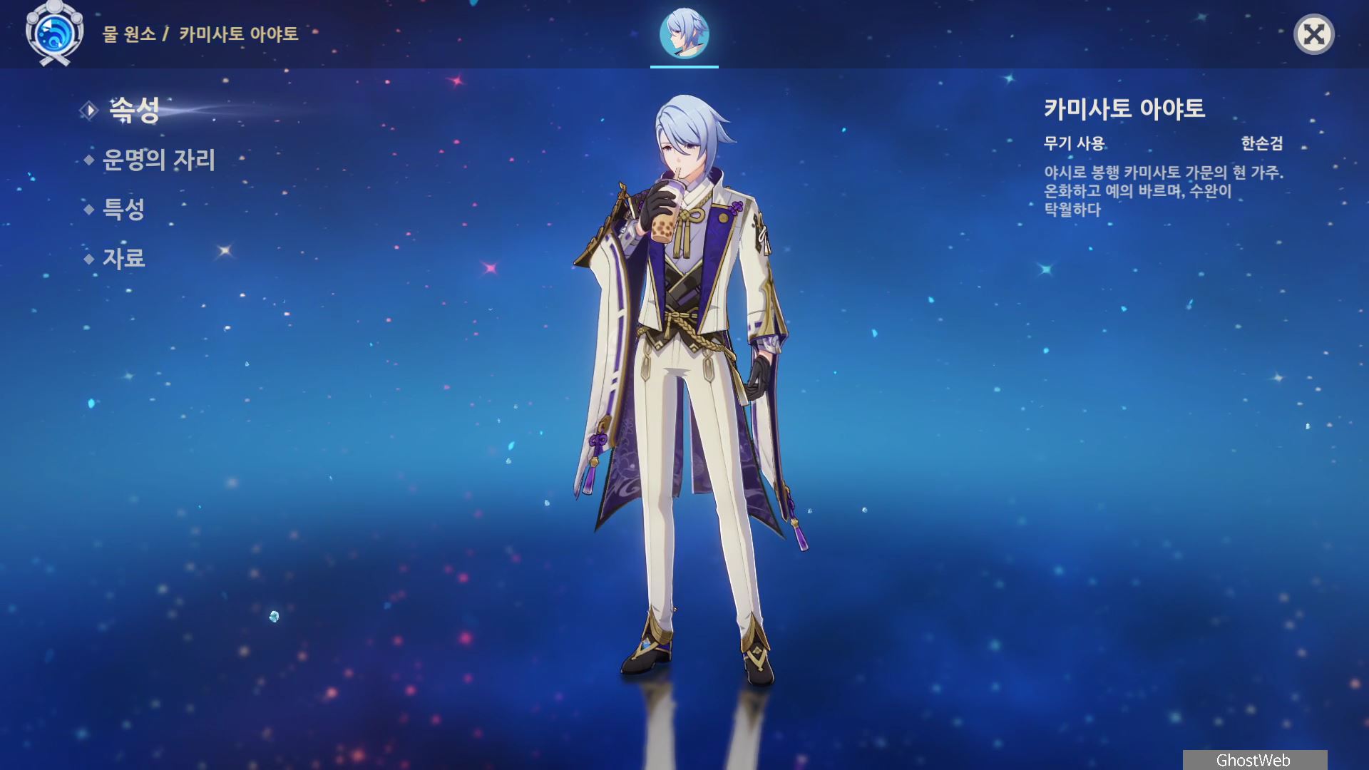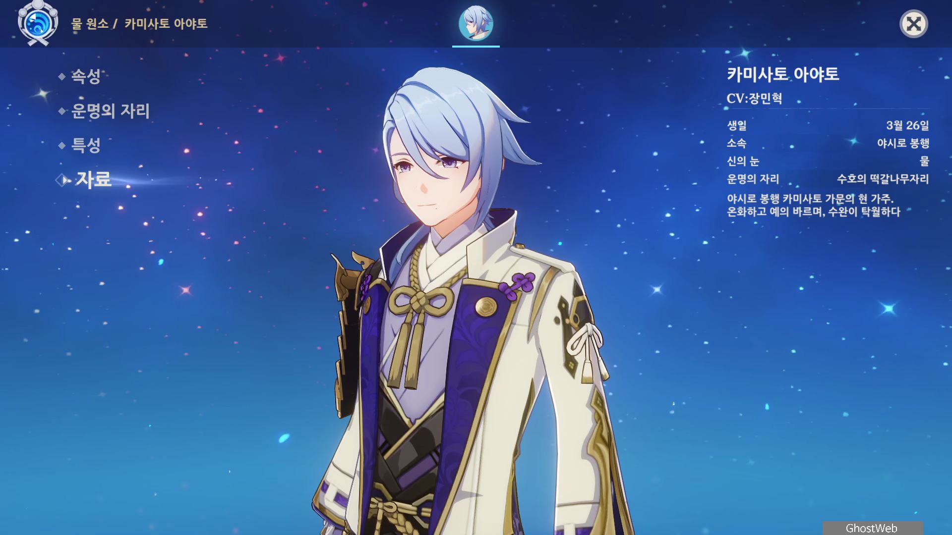 이번에는 이나즈마 야시로 봉행의 물 원소 캐릭터인 카미사토 아야토에 대해서 정리해보도록 할게요.