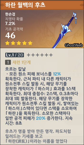 ○ 하란 월백의 후추 - 한손검 - 치명타 확률 : 7.2% - 기초 공격력 : 46 - 흐르는 칼날 · 모든 원소 피해 보너스를 12% 획득한다. 근처 내 다른 캐릭터가 원소전투 스킬 발동 시, 해당 무기를 장착한 캐릭터가 <하스이> 효과를 1스택 획득한다. · 최대 중첩수 : 2스택, 0.3초마다 최대 1회 발동 · 해당 무기를 장착한 캐릭터가 원소전투 스킬 발동 시, 쌓여있는 <하스이> 스택이 있다면 스택을 소모하여 <하란>을 획득한다. · 소모한 스택마다 일반 공격 피해가 20% 증가한다. · 지속 시간 : 8초 - 획득 방법 : 기원 (가챠, 뽑기) |
