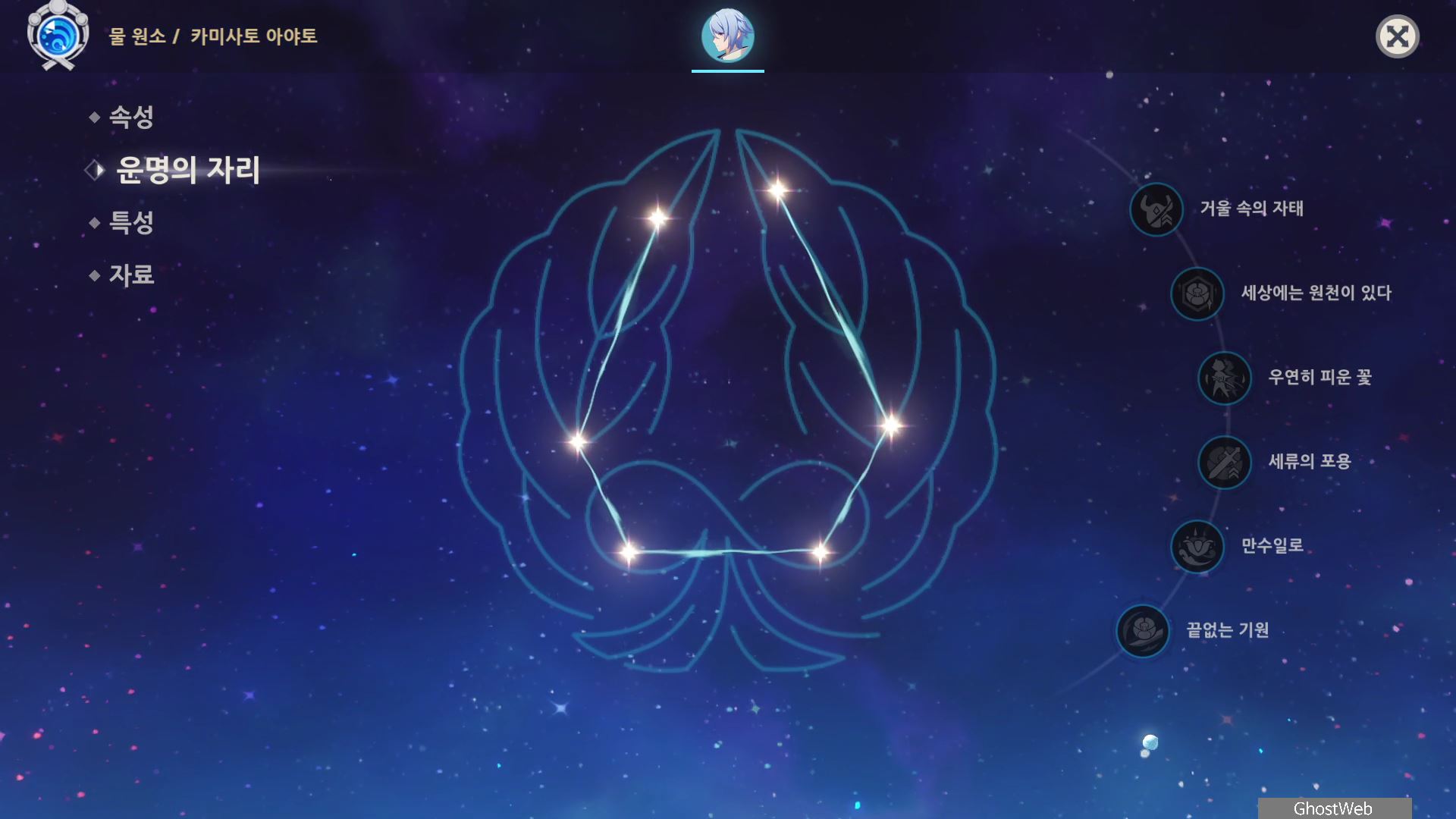 - 이동 후, 카미사토 아야토의 원래 자리에 <물의 잔영>이 생성된다.