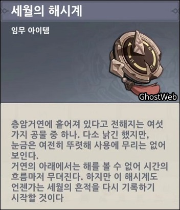 노천 광구 오른쪽에 있는 워프 포인트에서 11시 방향에 있는 테이블 탁자 위를 조사하면 <세월의 해시계>를 얻을 수 있어요.