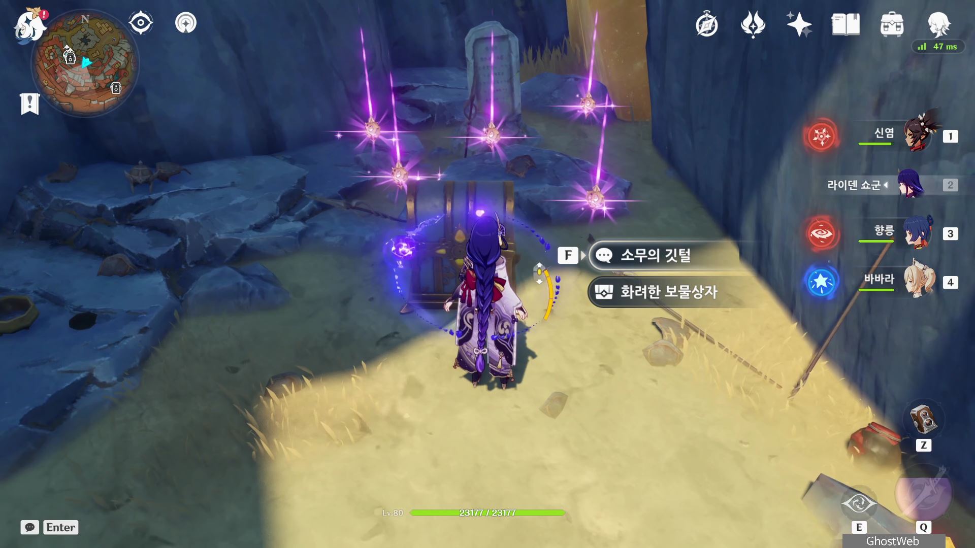 총 6개의 임무 아이템을 모으고 다시 노조무가 있던 곳으로 돌아가 아이템을 공양하면 근처 지하로 길이 생겨 아래에서 성유물, 보물상자를 열어 보상을 얻을수 있으며, 뒤에 있는 비석을 통해 이야기를 들을 수 있어요.