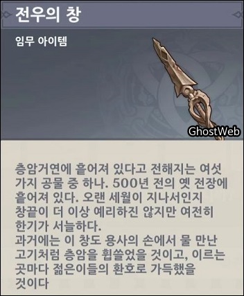찾아야 되는 임무 아이템은 관망의 꽃, 건배의 잔, 비상의 깃털, 세월의 해시계, 수호의 투구, 전우의 창으로 이 아이템들 중 몇개는 층암거연에 있는 필드와 산 꼭대기 부분에서 파밍이 가능하나 <건배의 잔>의 경우에는 <아무도 모르게 적진 잠임> 임무를 완료해야 나오는 보물상자에서 얻을 수 있어요.