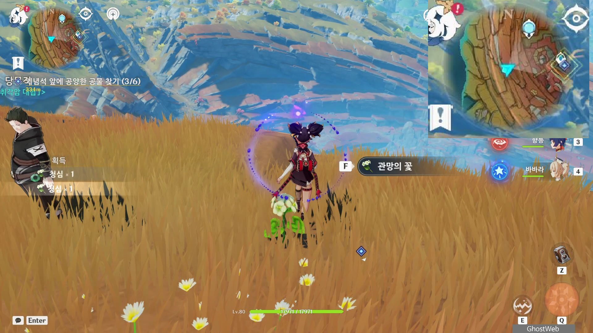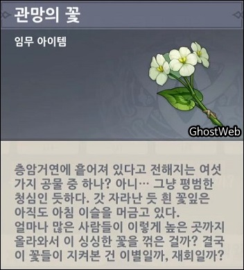 관망의 꽃은 단사 절벽 꼭대기에서 얻을 수 있으며, 꽃 옆에 있는 당무적과 대화를 통해 <바위 꼭대기 대협의 과거> 임무도 함께 진행할 수 있어요.