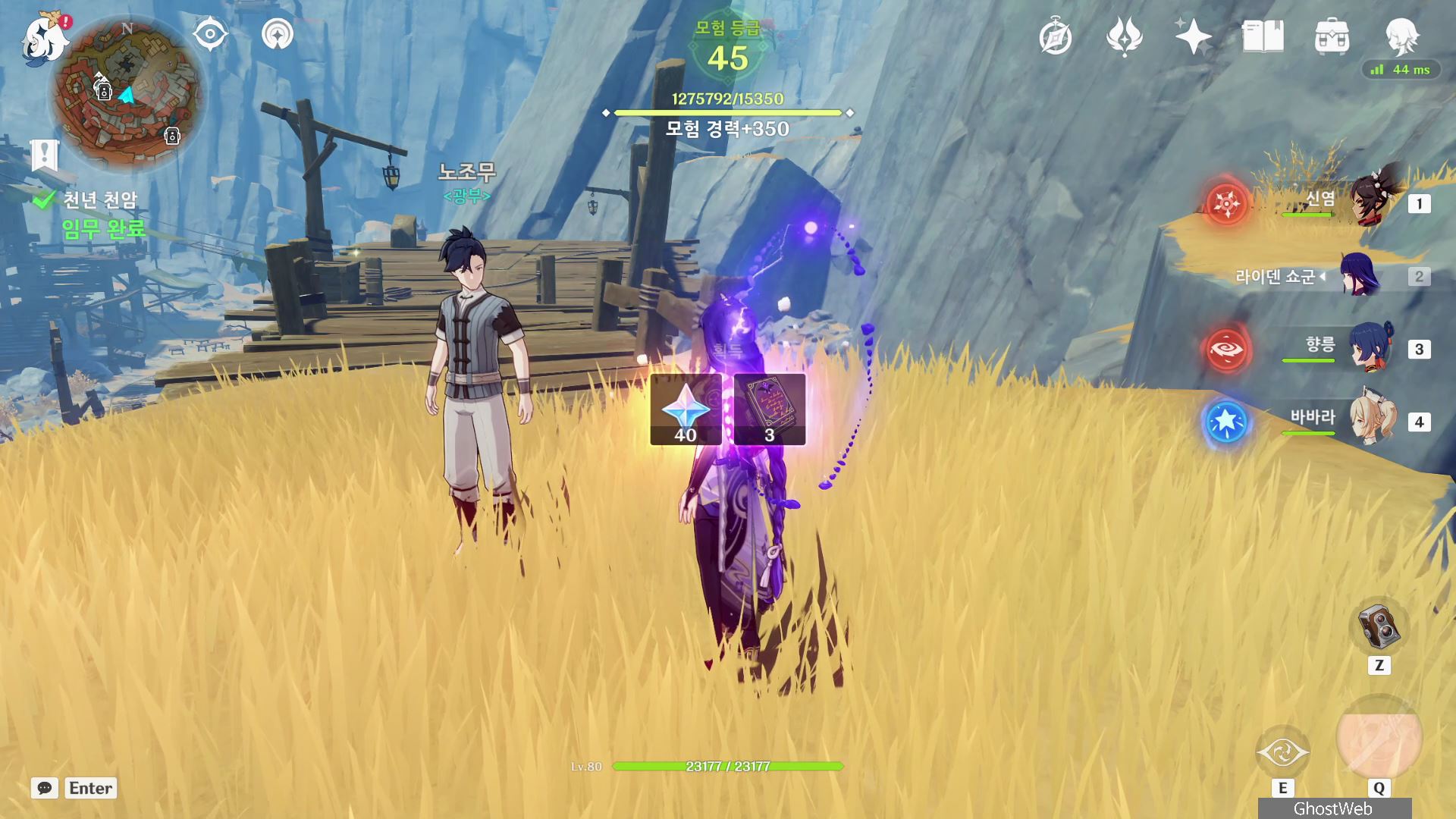 보물상자를 수령하고 다시 노조무에게 돌아가 대화를 하면 임무 완료와 보상으로 원석 40개, 영웅의 경험 3개, 모험 경력 350, 30000모라, 정제용 마법 광물 6개를 얻을 수 있어요.