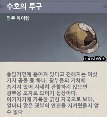바로 옆에 있는 화약통을 폭발시키거나 불 원소 캐릭터의 불 원소 공격을 통해 불을 붙이면 바닥 아래의 공간이 나오는데, 이 공간을 조사하면 <수호의 투구>를 얻을 수 있어요.