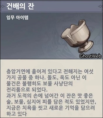 해당 임무를 완료하고 나오는 보물상자를 열면 <건배의 잔>을 얻을 수 있어요.