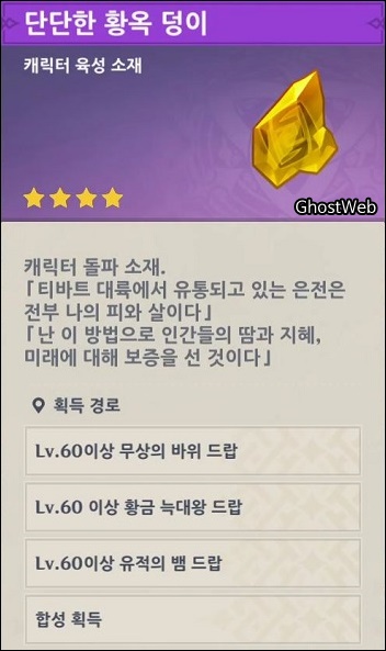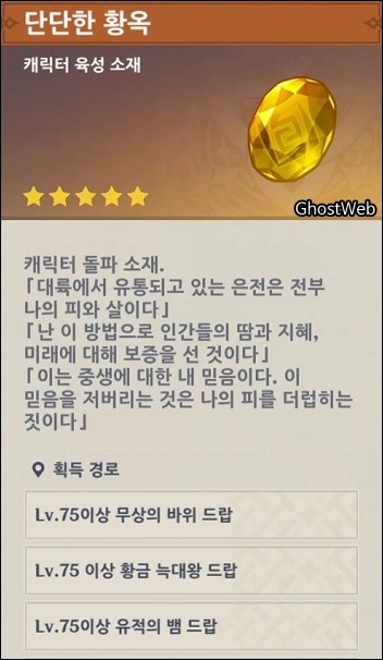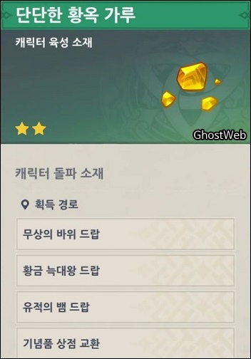 - 단단한 황옥 가루, 단단한 황옥 조각, 단단한 황옥 덩이, 단단한 황옥 (바위 원소 캐릭터 육성 소재)