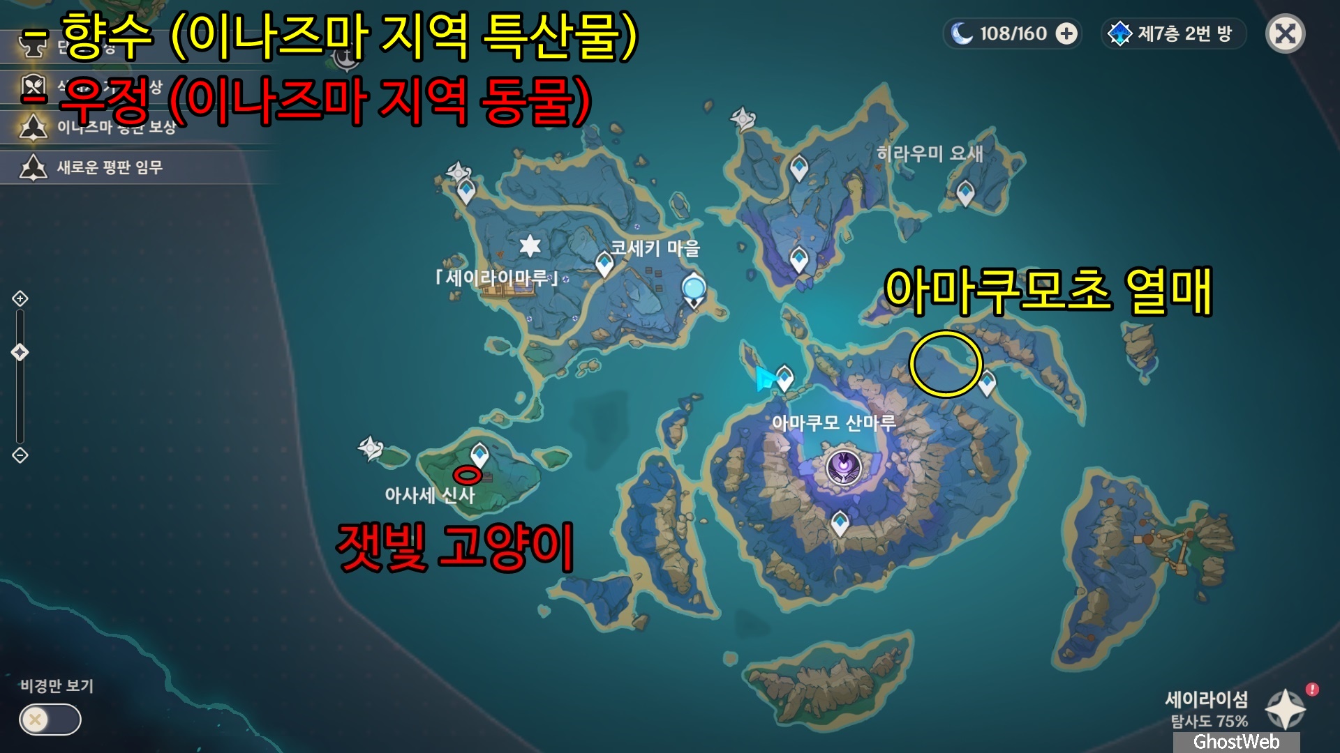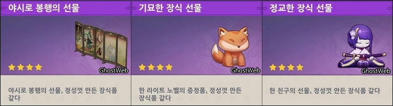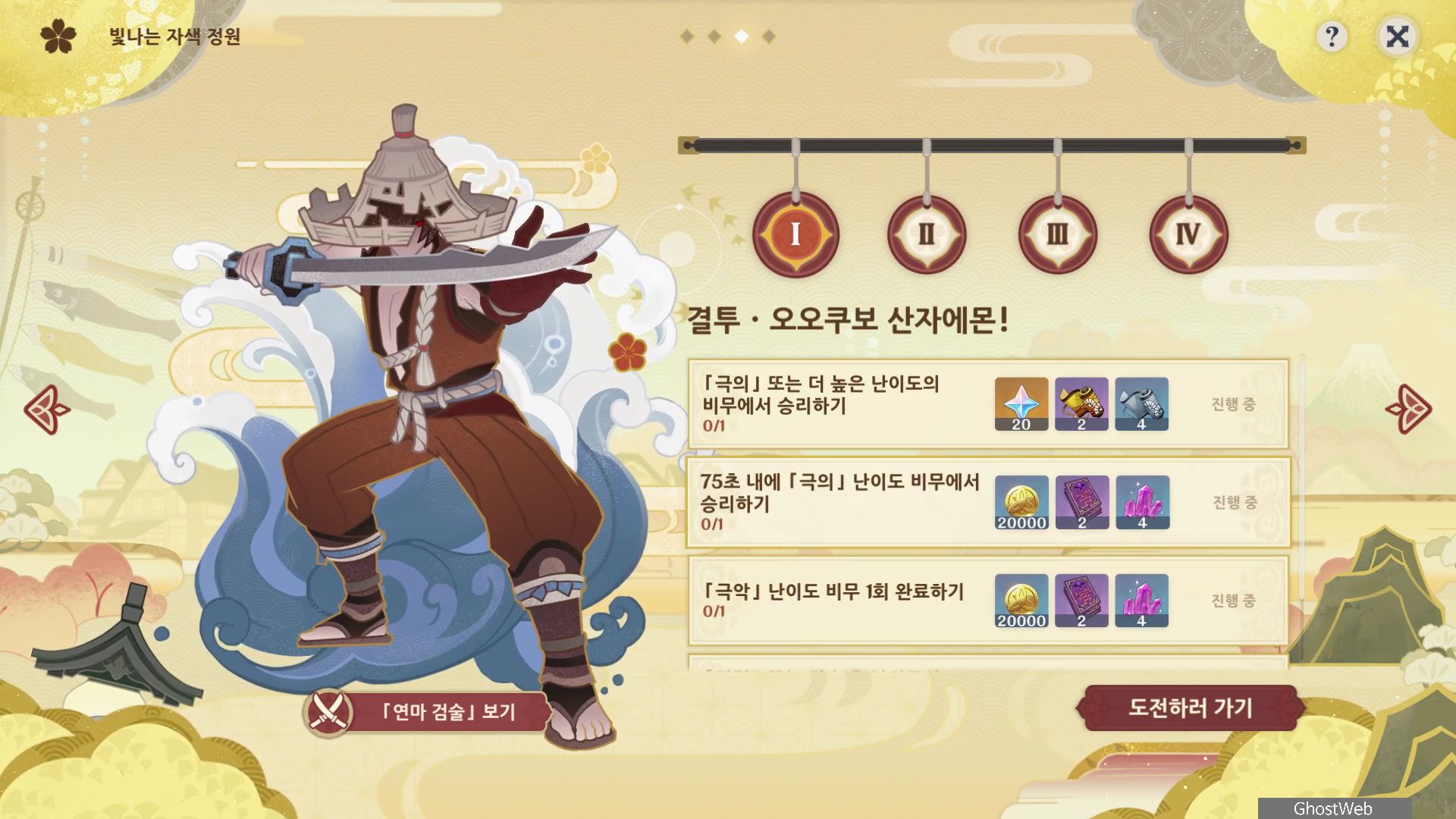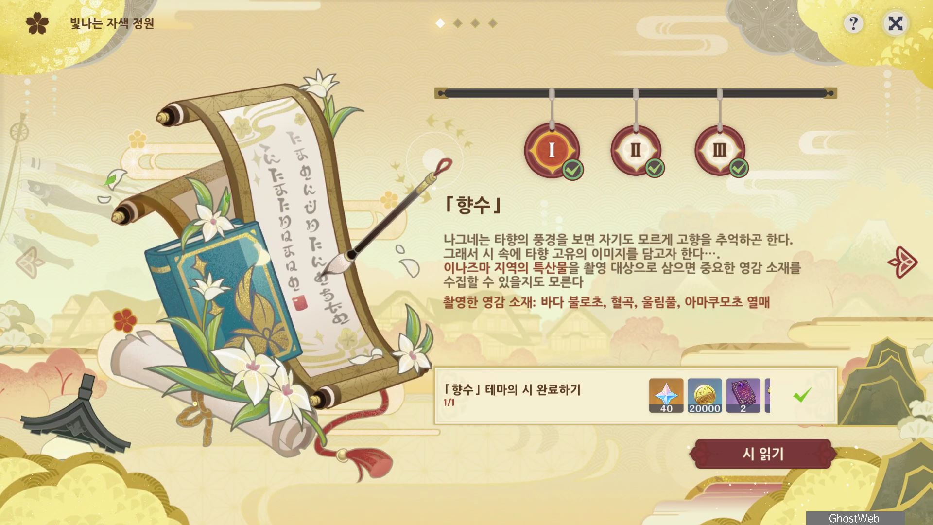 - 보상 : 각 임무마다 원석 40, 20000 모라, 경험치 책, 캐릭터 특성 육성 소재 (부세/풍아/천광의 철학)
