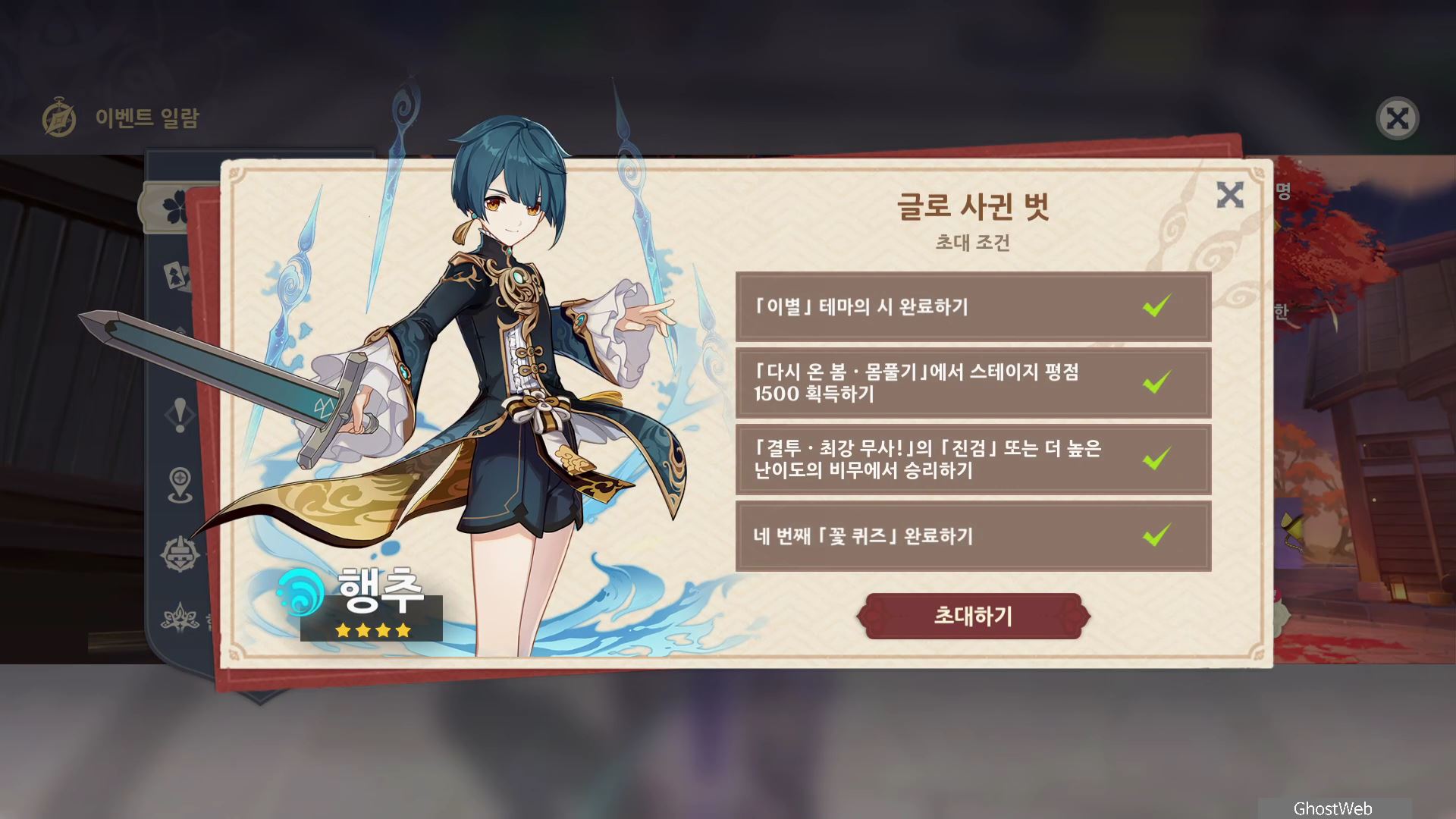 4개의 컨텐츠의 해당 항목을 완료하면 4성의 물 원소 캐릭터인 행추, 원석, 지식의 왕관을 받을 수 있어요.
