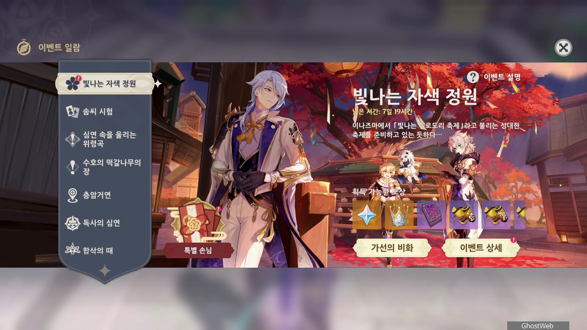 빛나는 자색 정원 이벤트는 이나즈마에서 열리는 빛나는 이로도리 축제로 아내의 조건을 먼저 만족해야 참여할 수 있어요. (스토리 진행 상 수호의 떡갈나무, 천하인의 장 제2막, 잠든 용의 장 제1막을 완료 후 이벤트 참여 추천)