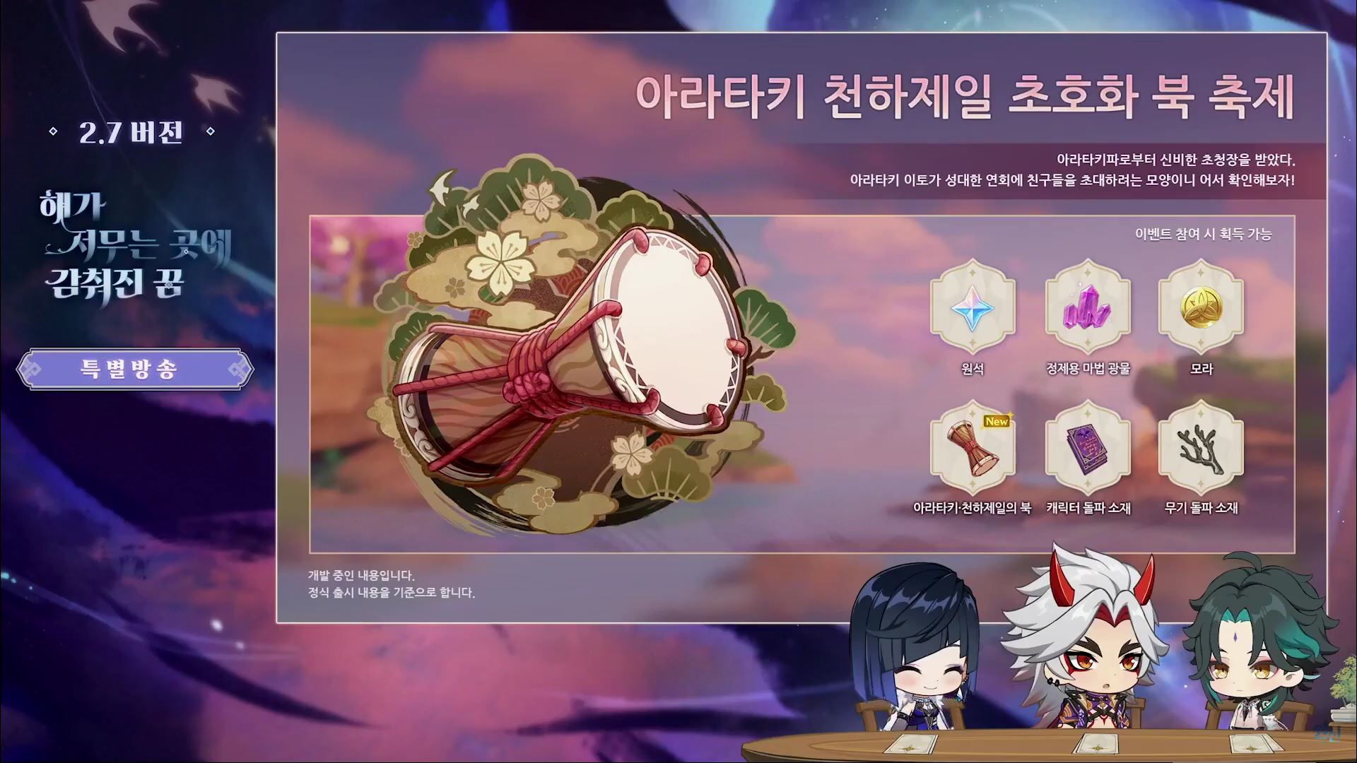 - 보상 : 원석, 정제용 마법 광물, 모라, 아라타키 천하제일의 북, 캐릭터 돌파 소재, 무기 돌파 소재