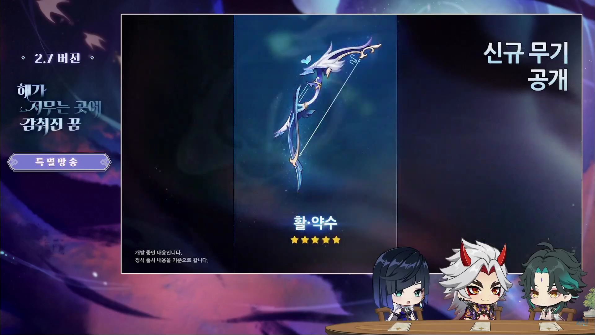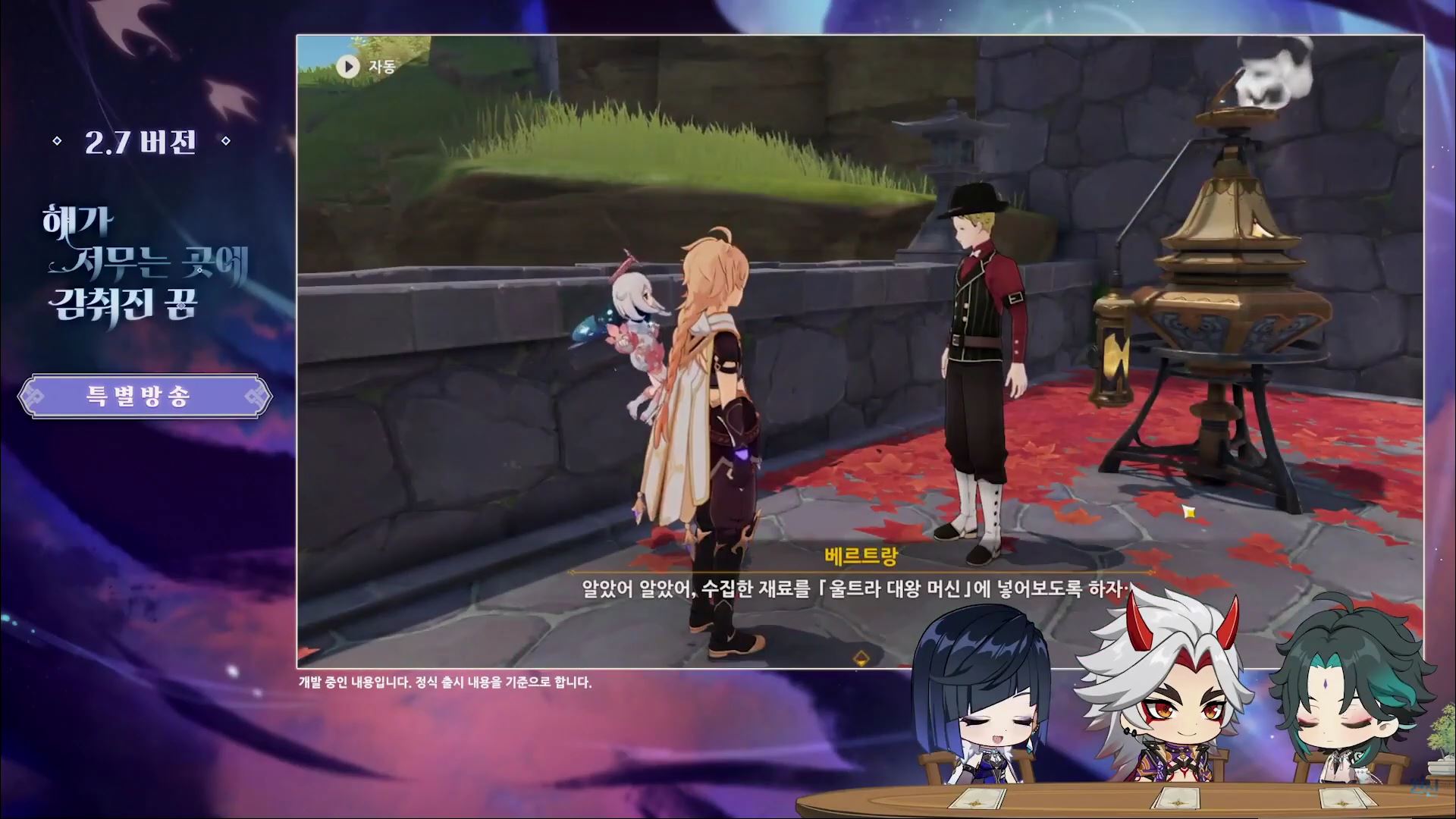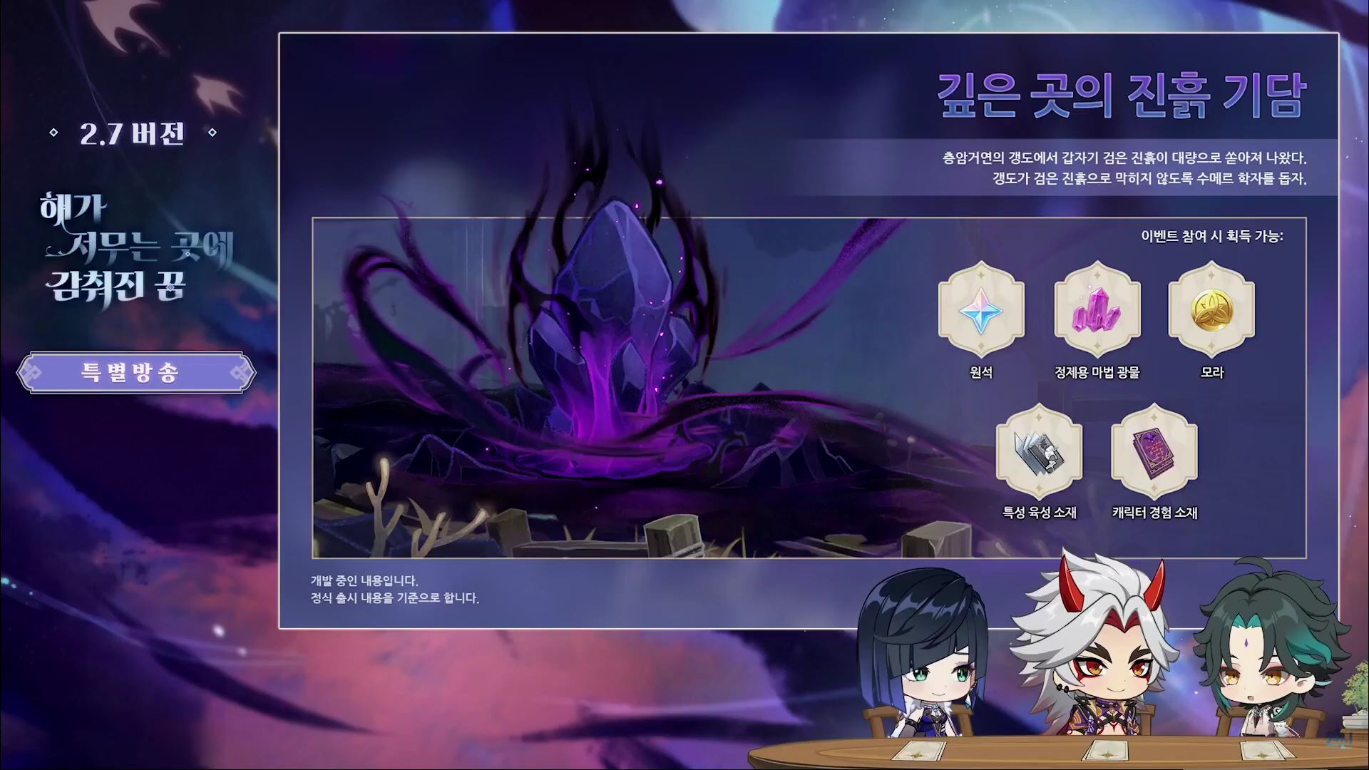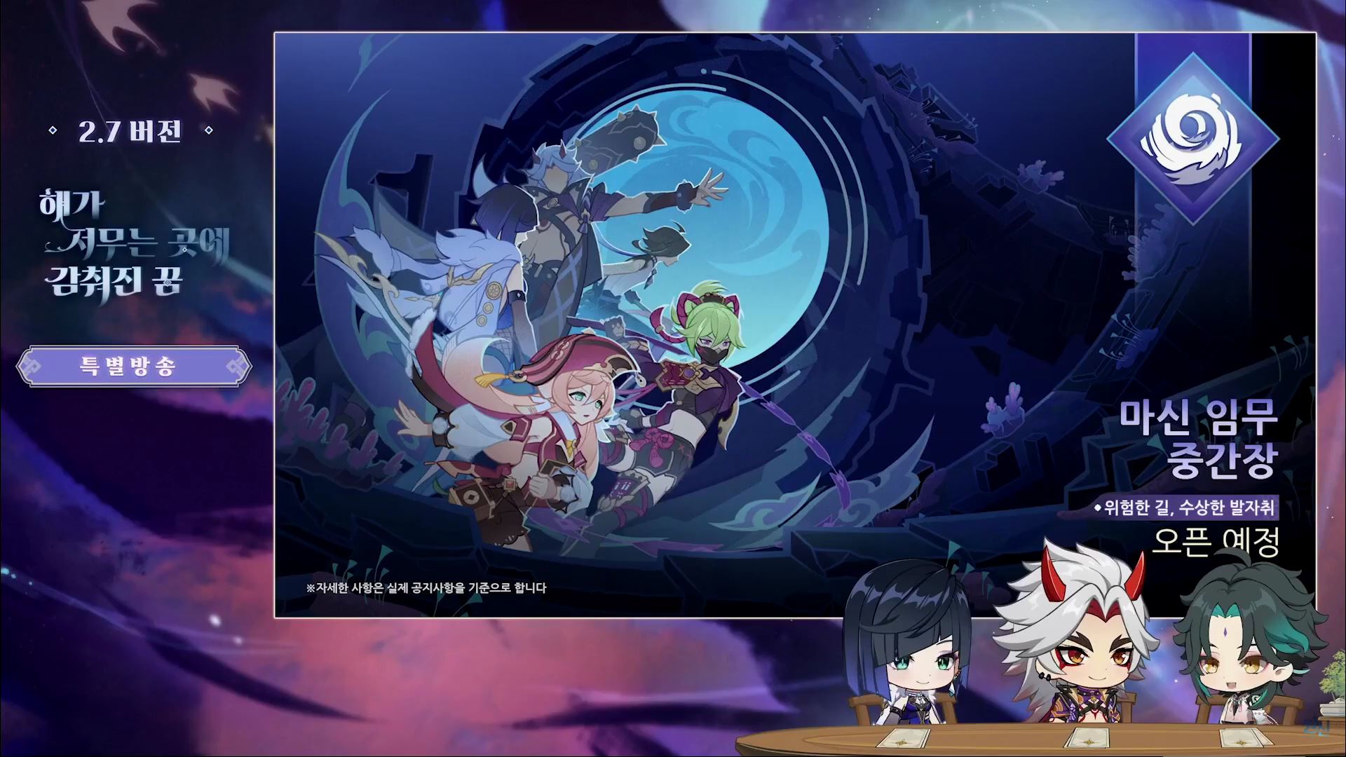 유튜브 원신 채널에서 2.7 버전 특별 방송을 정리한 것으로 듣고 정리한 거라, 오타 또는 2.7 업데이트 시 내용이 수정되어 있을 수도 있어요.