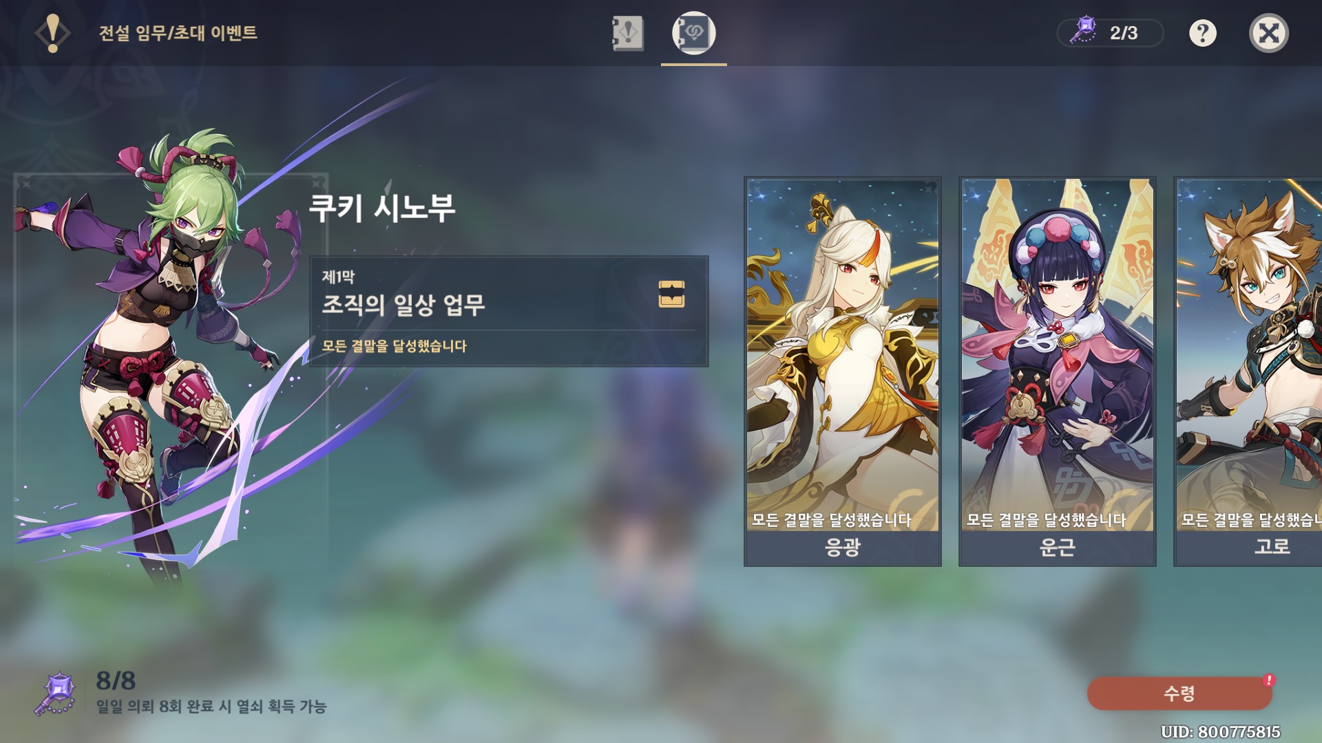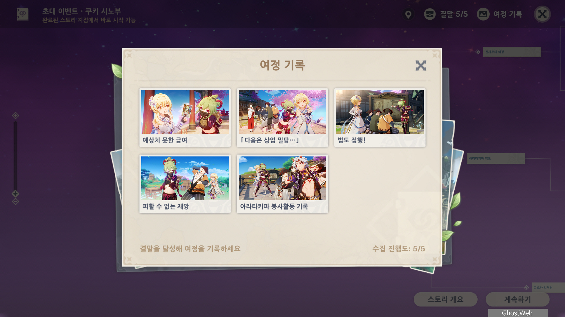 쿠키 시노부 초대 이벤트 <제1막 - 조직의 일상 업무>은 총 5개의 여정 기록(엔딩)으로 나눠져 있으며, 각 엔딩을 볼 때마다 원석, 경험치 책 등의 보상을 얻을 수 있어요.