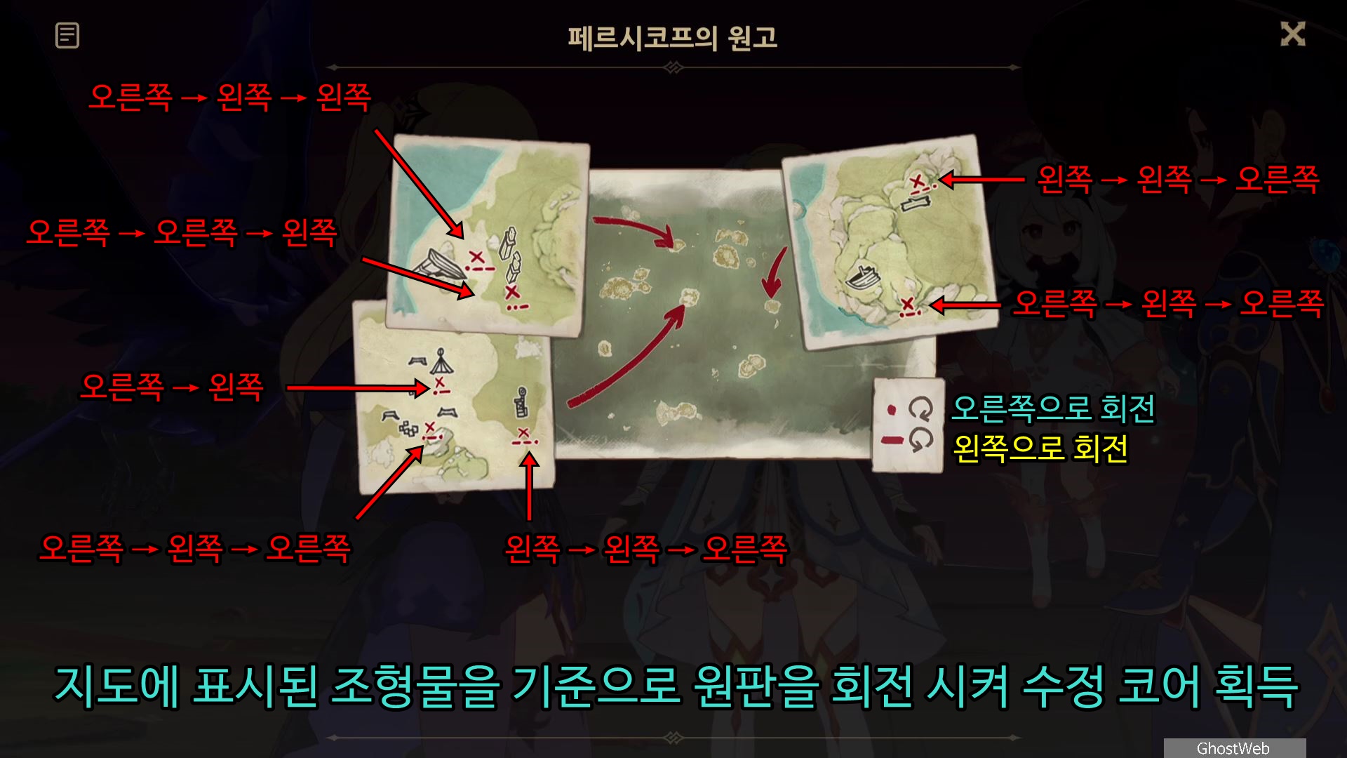 지도에 표시된 곳으로 가 원고에 표시된 조형물 근처에 있는 원판 장치에 가서 각 순서에 맞게 회전을 시키면 공중에 있던 수정 코어가 지상으로 내려와 이를 획득할 수 있어요.
