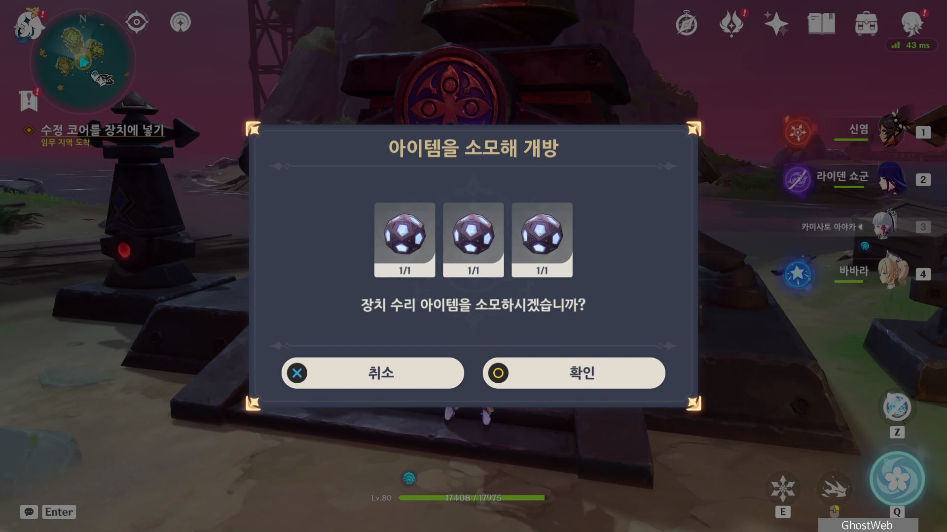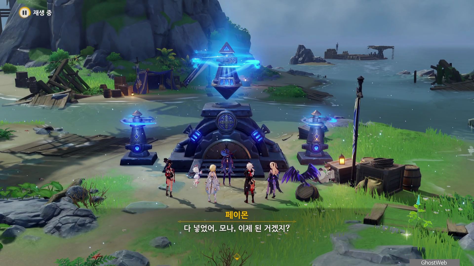 3개의 섬에서 수정 코어를 모아 다시 우인단이 있던 섬으로 돌아와 장치 수리를 하면 해당 스토리를 완료할 수 있어요.