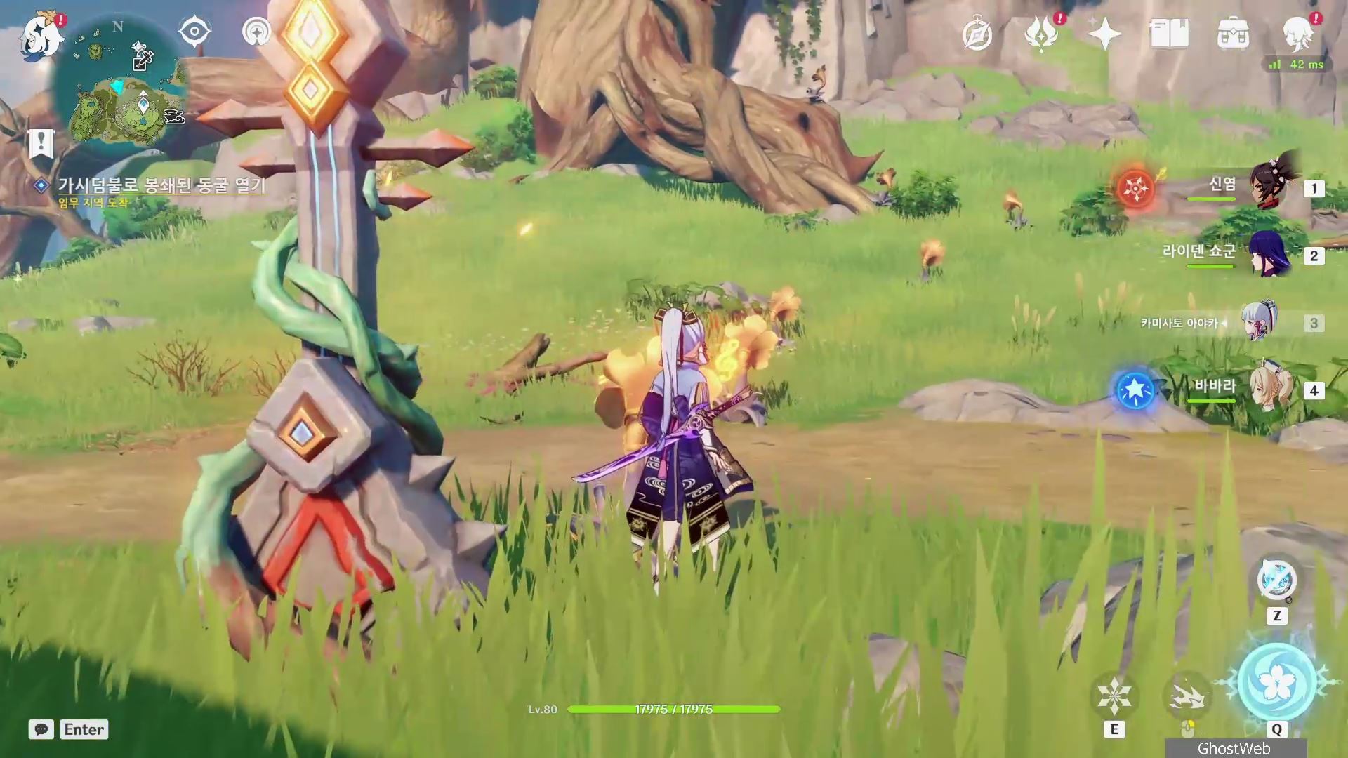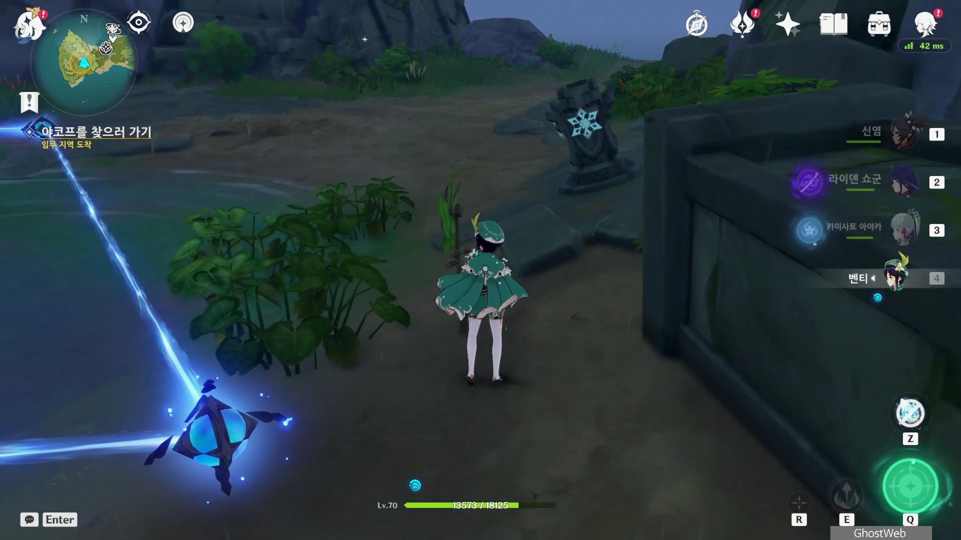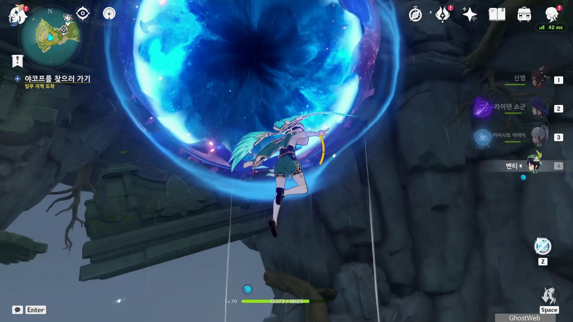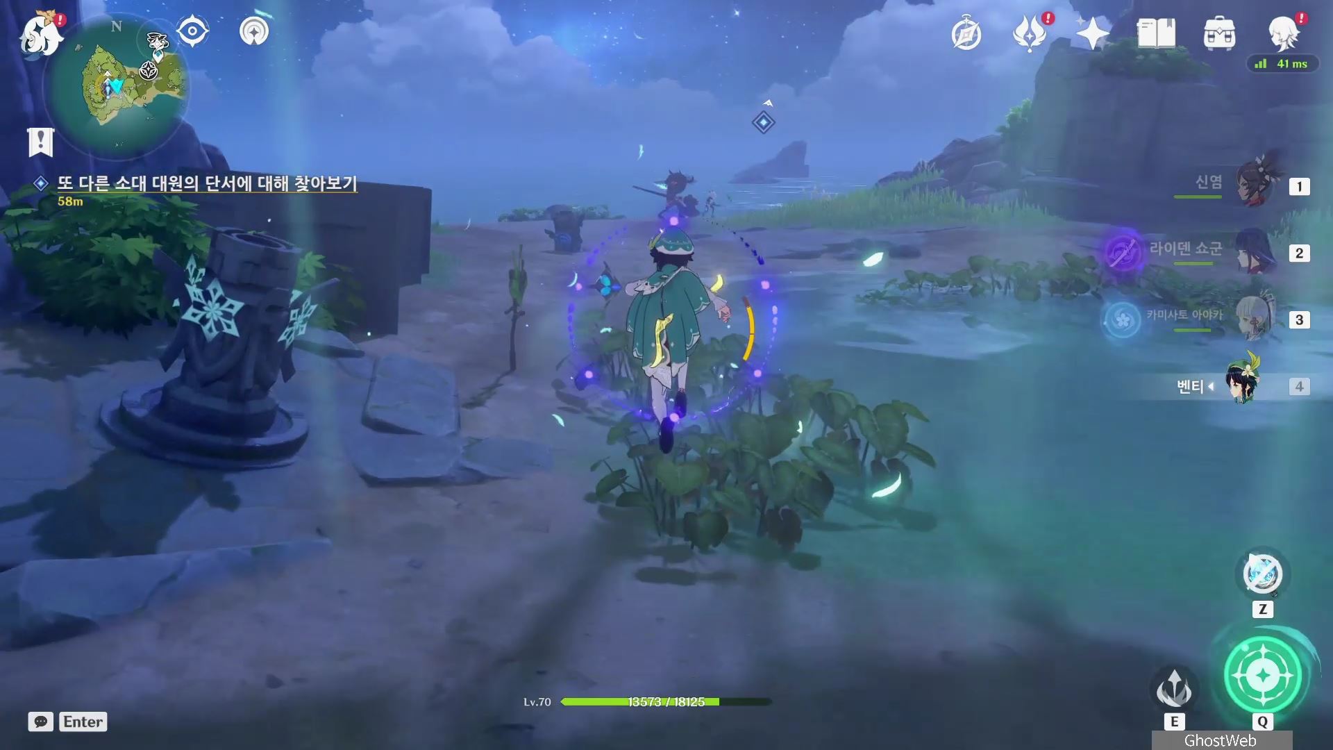 - 바람 원소 캐릭터로 아래에 있는 바람개비를 바람 원소 공격하여 윈드 필드를 생성하여 워프 포인트타고 이동하기