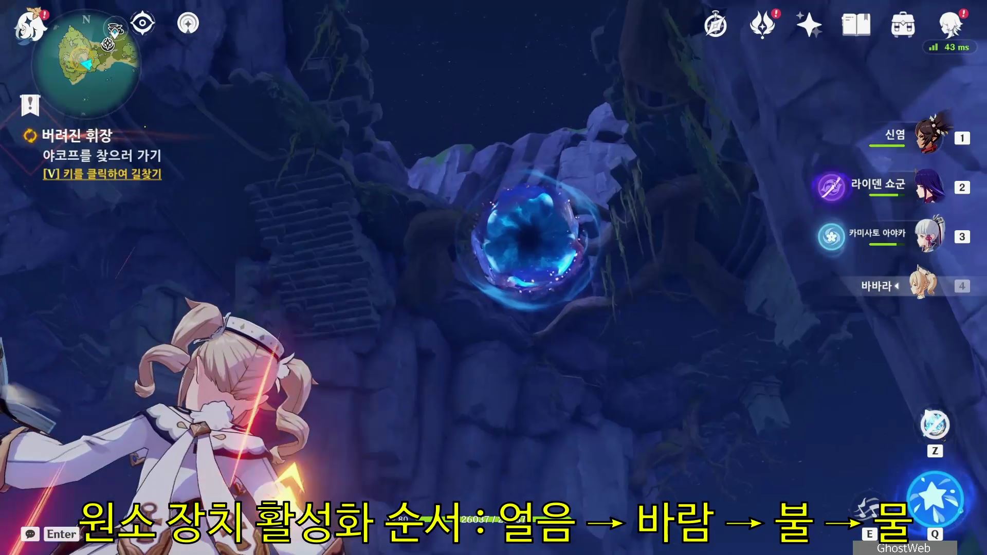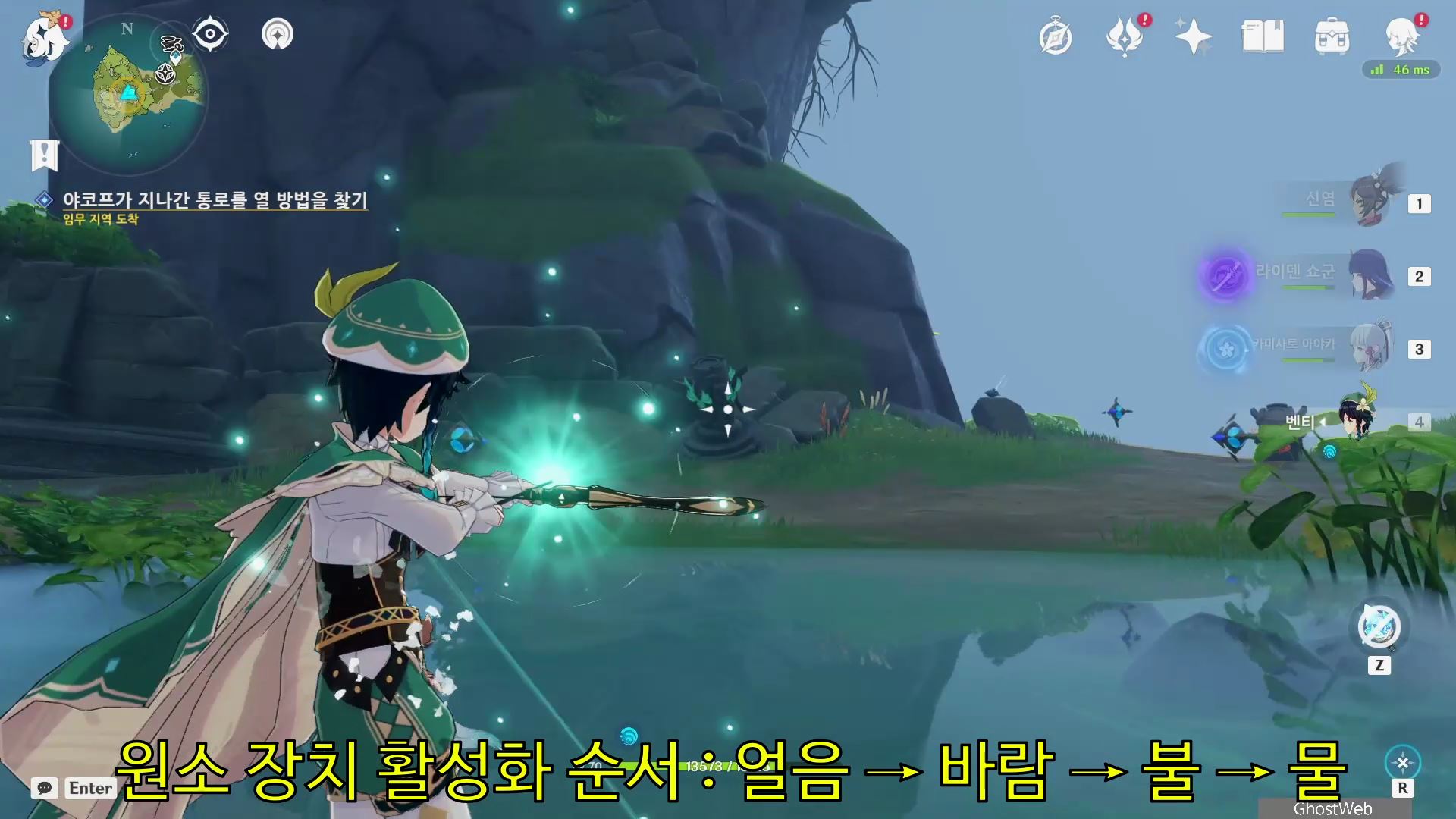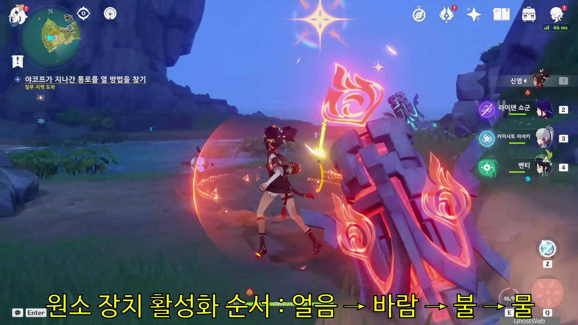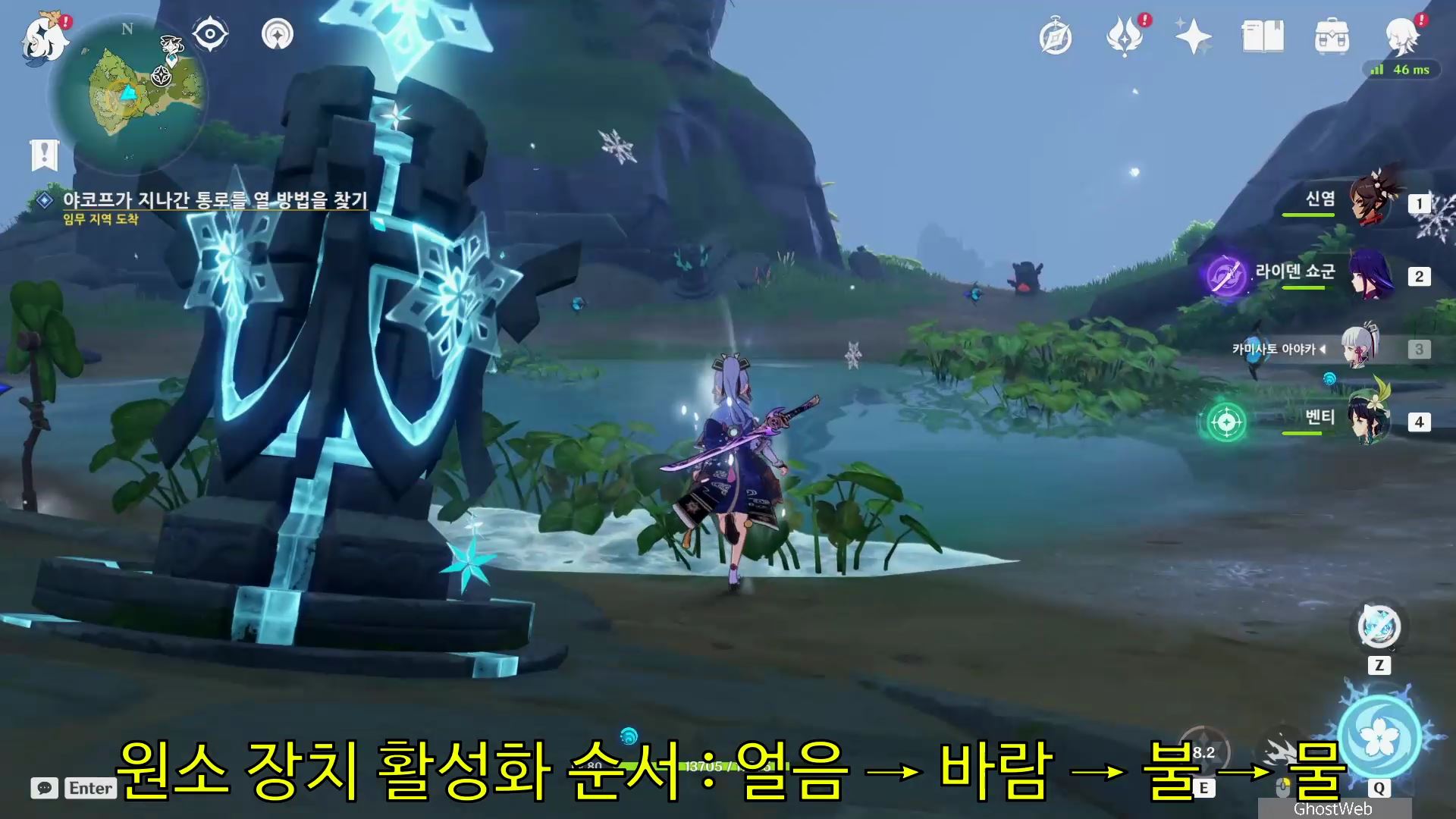- 해당 지역 맨 아래 층에 있는 원소 장치 등을 얼음 → 바람 → 불 → 물 순서대로 장치를 활성화 하기