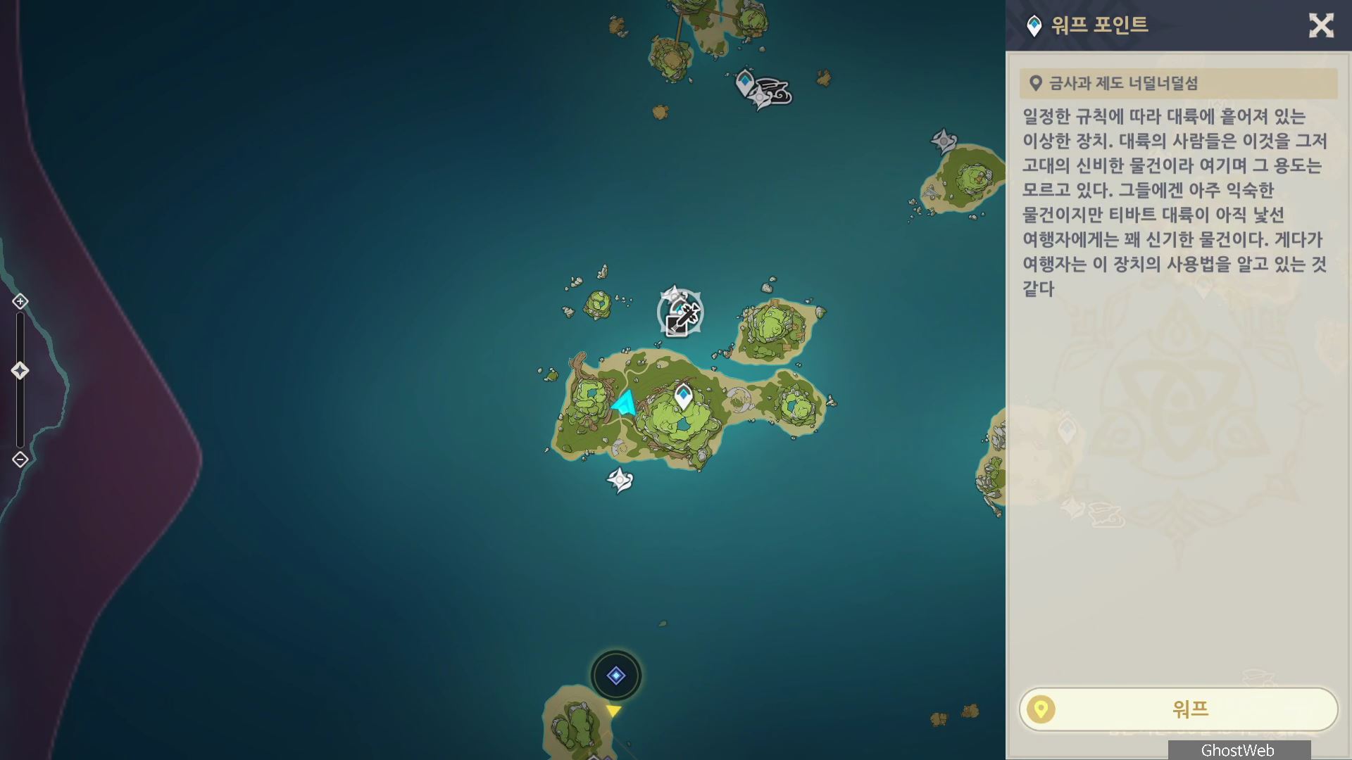 이번에는 금사과 제도(2022) 너덜너덜 섬 지하에 있는 메아리 소라(영상 소라)를 얻을 수 있는 방법에 대해서 정리해볼게요. 너덜너덜 섬 중앙 워프 포인트로 이동하면 미니맵에 워프 포인트 기준