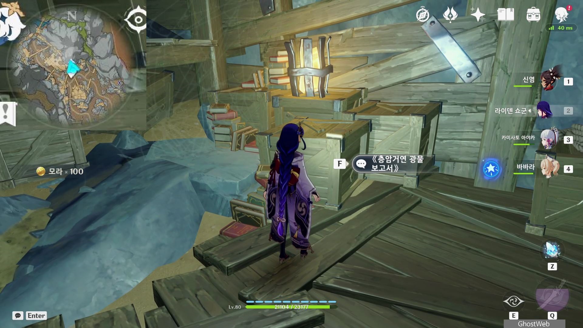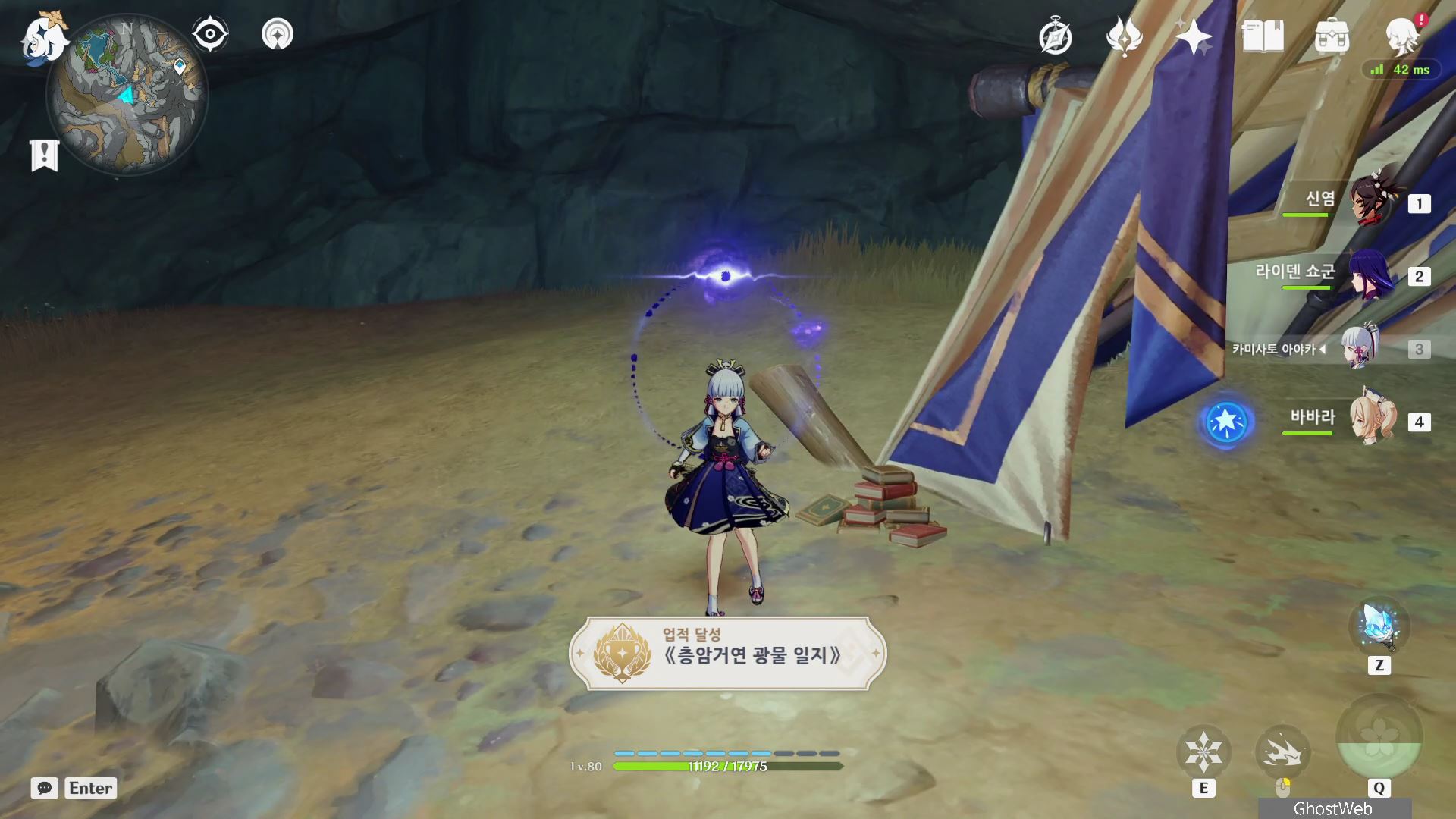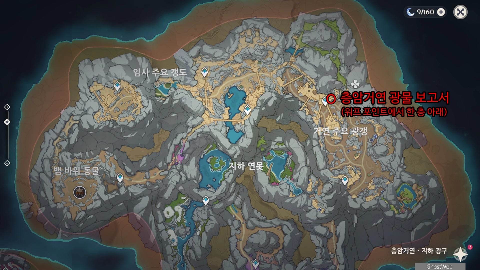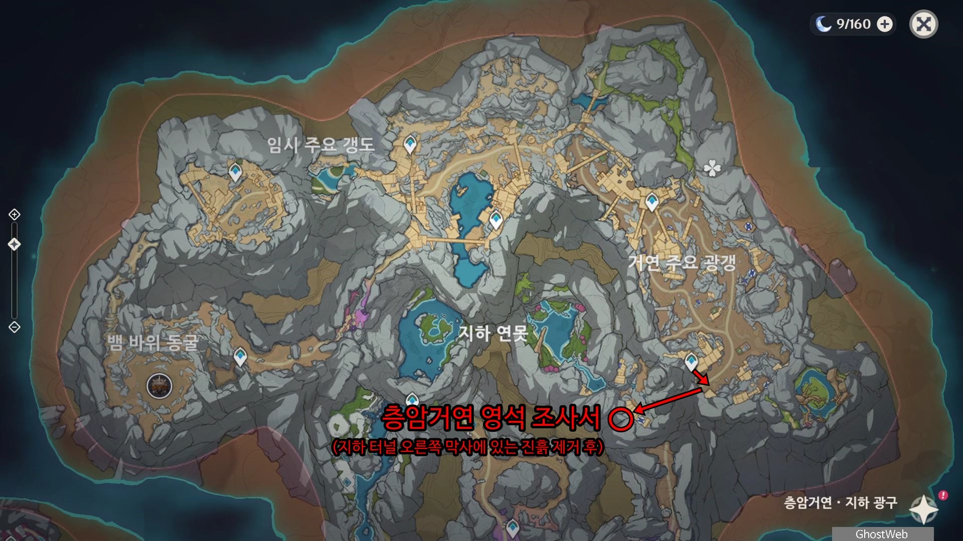 층암거연 영석 조사서는 층암거연 지하 광구 지도에서 <거연 주요 광개> 아래 쪽에 있는 워프 포인트로에서 맨 아래로 내려가 지하 동굴로 들어간 다음 지하 갈림길에서 오른쪽으로 향하면 막사가 있어요.