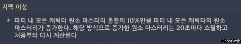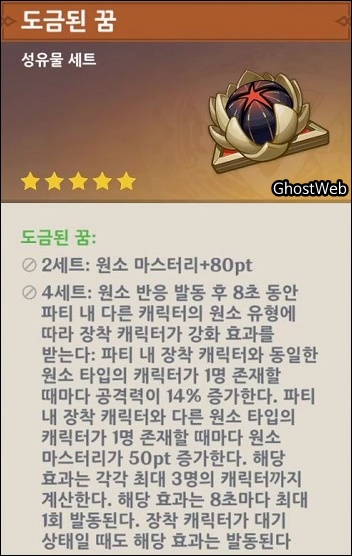 - 4~5성 성유물 획득 가능 ○ 2세트 - 원소 마스터리+80pt ○ 4세트 - 원소 반응 발동 후 8초 동안 파티 내 다른 캐릭터의 원소 유형에 따라 장착 캐릭터가 강화 효과를 받는다. - 파티 내 장착 캐릭터와 동일한 원소 캐릭터가 1명 존재할 때 마다 공격력이 14% 증가 - 파티 내 장착 캐릭터와 다른 원소 타입의 캐릭터가 1명 존재할 때마다 원소 마스터리가 50pt 증가 - 해당 효과는 각각 최대 3명의 캐릭터까지 계산 - 해당 효과는 8초마다 최대 1회 발동된다. - 장착 캐릭터가 대기 상태일 때도 해당 효과는 발동 |