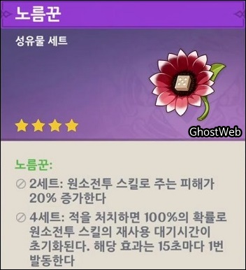 - 3~4성 성유물 획득 가능 ○ 2세트 - 원소전투 스킬로 주는 피해가 20% 증가 ○ 4세트 - 적을 처치하면 100%의 확률로 원소전투 스킬의 재사용 대기시간이 초기화 - 해당 효과는 15초마다 1번 발동 |