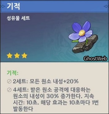 - 3~4성 성유물 획득 가능 ○ 2세트 - 모든 원소 내성 +20% ○ 4세트 - 받은 원소 공격에 대응하는 원소의 내성이 30% 증가 - 지속 시간 : 10초 - 해당 효과는 10초마다 1번 발동 |