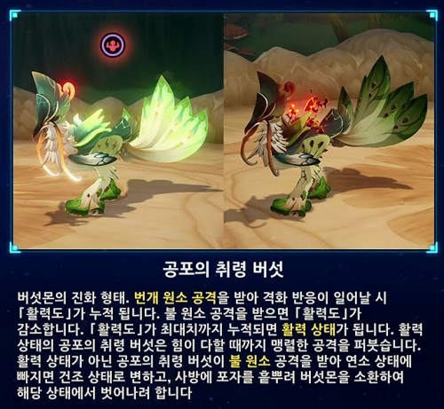 2. 불 원소 공격을 받으면 활력도가 감소되며, 연소 상태에 빠지면 건조 상태로 변하며 주변에 버섯몬을 소환 (3마리?)