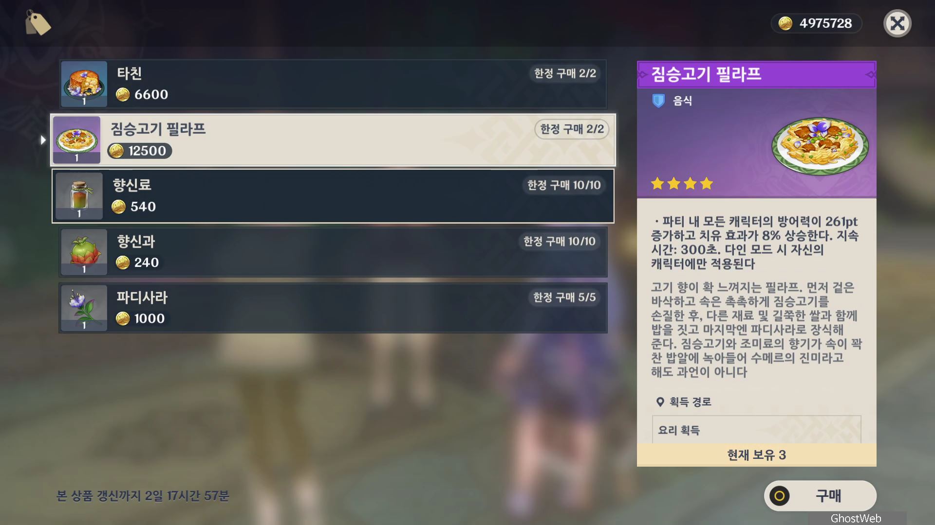 - 짐승고기 필라드 (12500모라, 한정 구매 2개, 방어력 상승 음식)