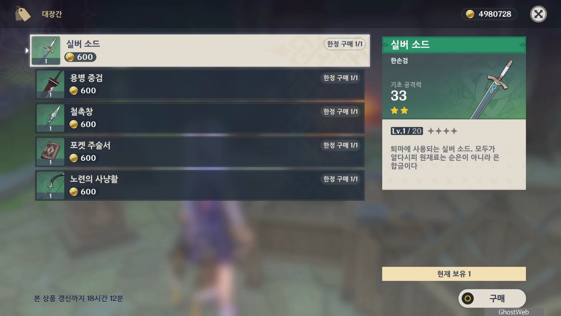 ○ 판매 무기 : 실버 소드, 용병 중검, 철촉창, 포켓 주술서, 노련의 사냥할 (600 모라)