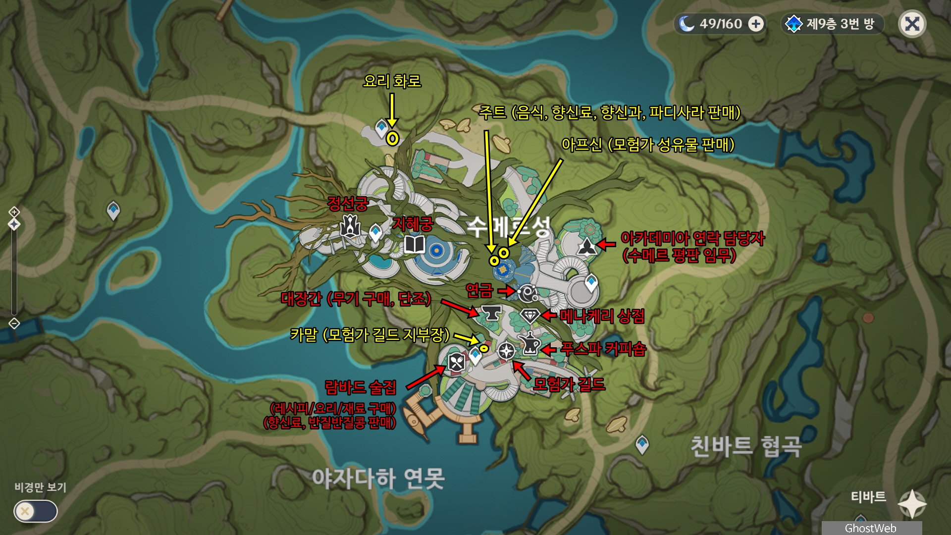 수메르 성은 내부(바자르, 닐루 만난 곳, 내부), 지상, 나무 위쪽 지역으로 나뉘는데, 대부분 판매 NPC 들은 지상, 지상에 있는 건물 안에 있으니 이점 참고하세요.