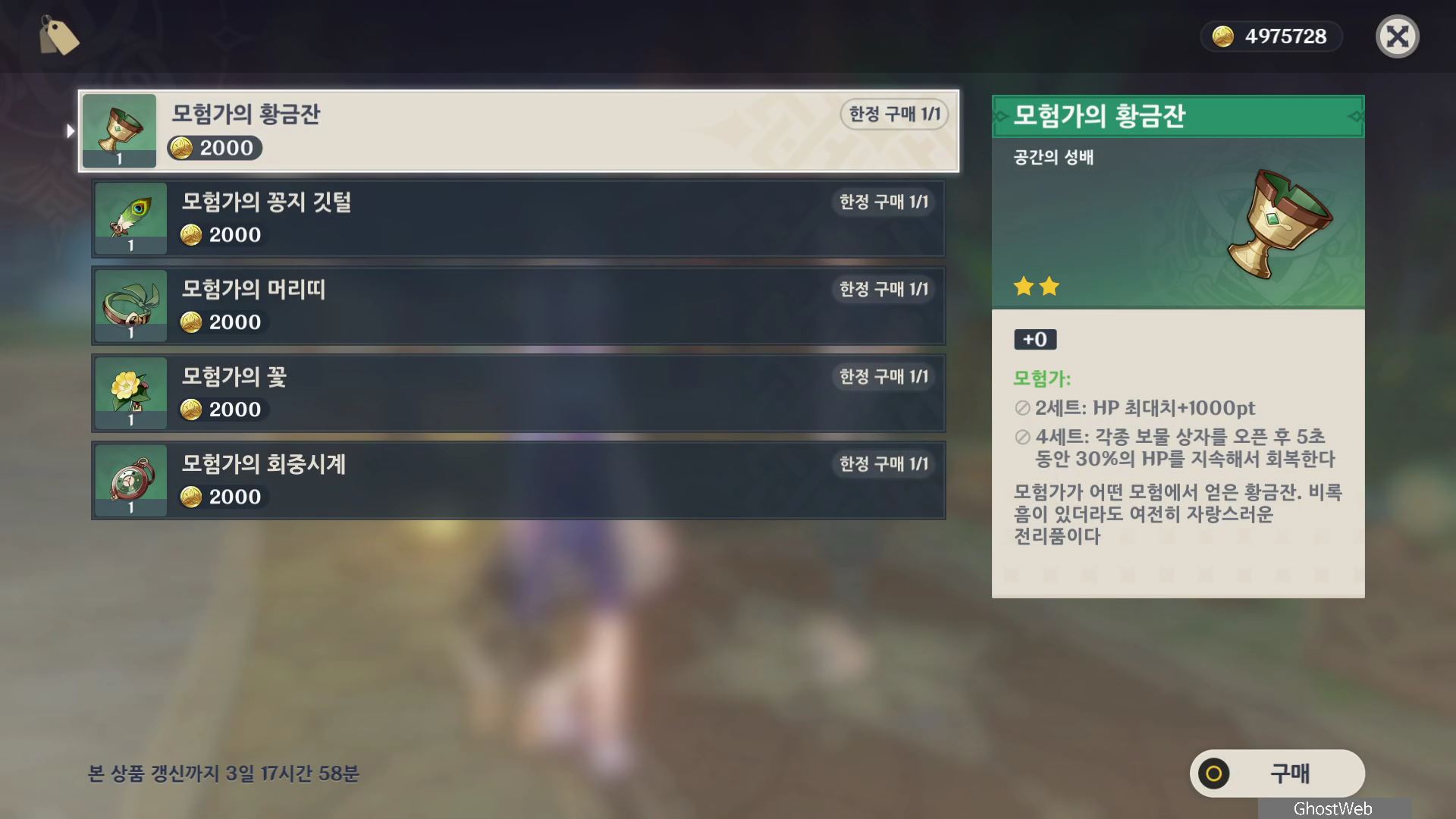 - 모험가의 황금잔, 모험가의 꽁지 깃털, 모험가의 머리띠, 모험가의 꽃, 모험가의 회중 시계 (2000 모라)
