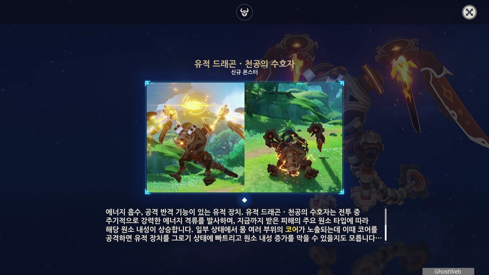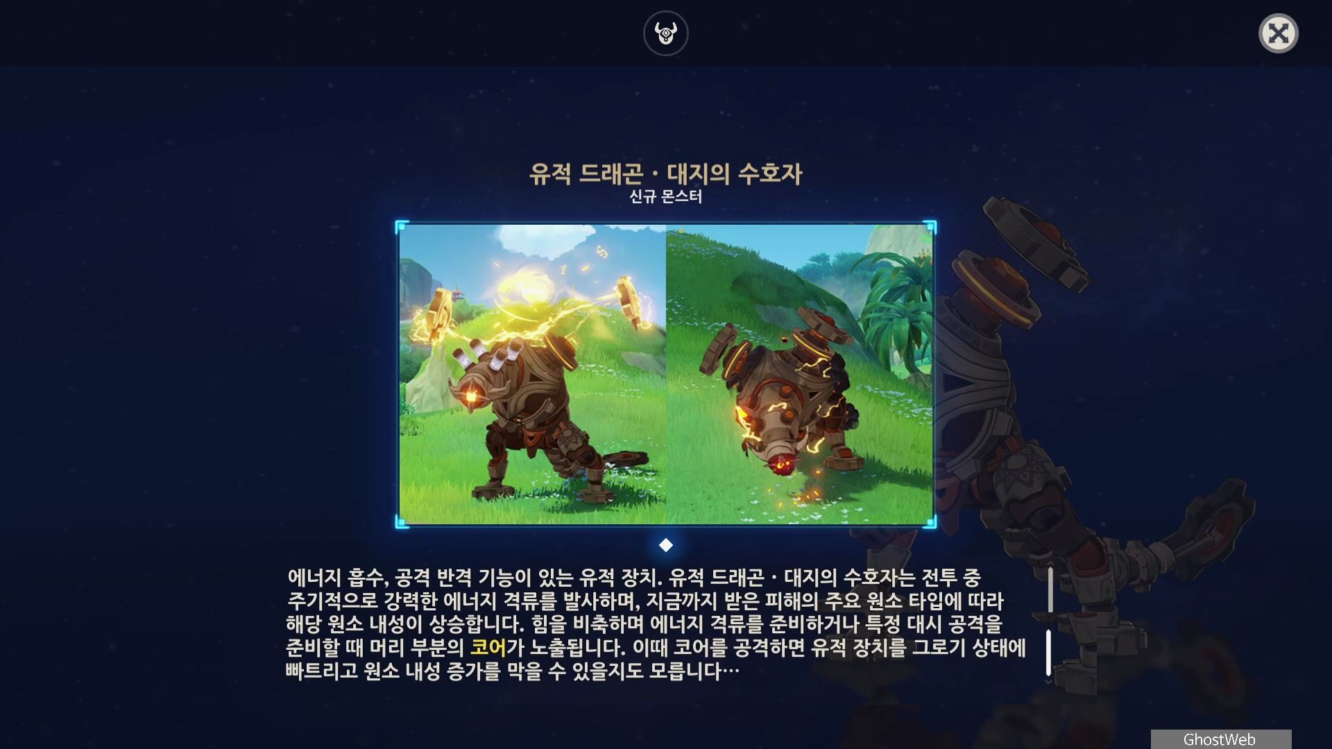 피해 받은 주요 원소 타입에 따라 원소 내성이 상승하고, 코어가 노출될 때 코어를 공격하면 그로기(다운 상태)가 됩니다. (대지의 수호자 - 지상 타입 / 천공의 수호자 - 공중 타입)