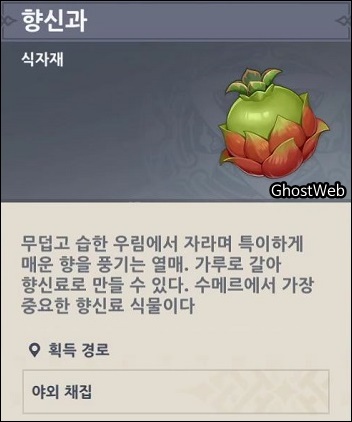 향신과는 식자재 가공을 통해 향신료를 만들 수 있으며, 수메르 낚시터에서 물고기를 낚을 수 있는 감로 미끼를 만들 수 있는 재료에요.