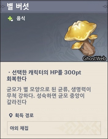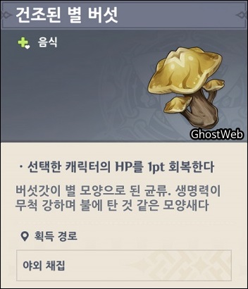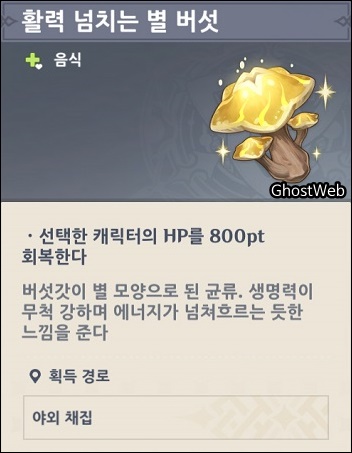필드에서 별 버섯을 그냥 채집하지 않고 번개 원소로 공격하면 <활력 넘치는 별 버섯>이 되며, 불 원소로 공격하면 <건조된 별 버섯>으로 변경되니 이점 참고하세요.