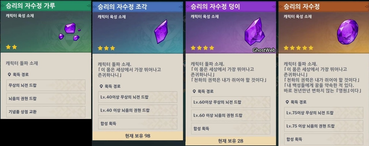 - 승리의 자수정 가루/조각/덩이 (번개 원소 캐릭터 육성 소재)