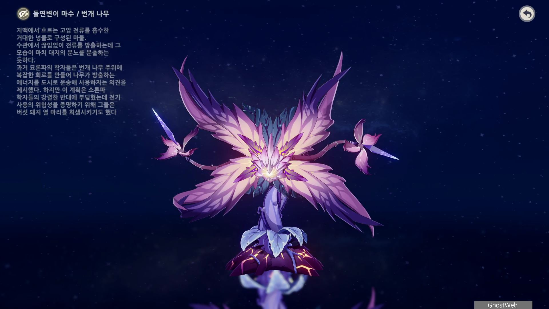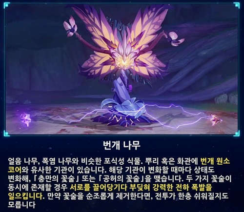 - 번개 나무는 얼음/불 나무와 공략 방법이 같아 번개 나무의 원핵이 화관, 뿌리에 응집될 때 이를 공격하여 넉 다운을 시킨다음 공격을 하여 치치할 수 있어요.