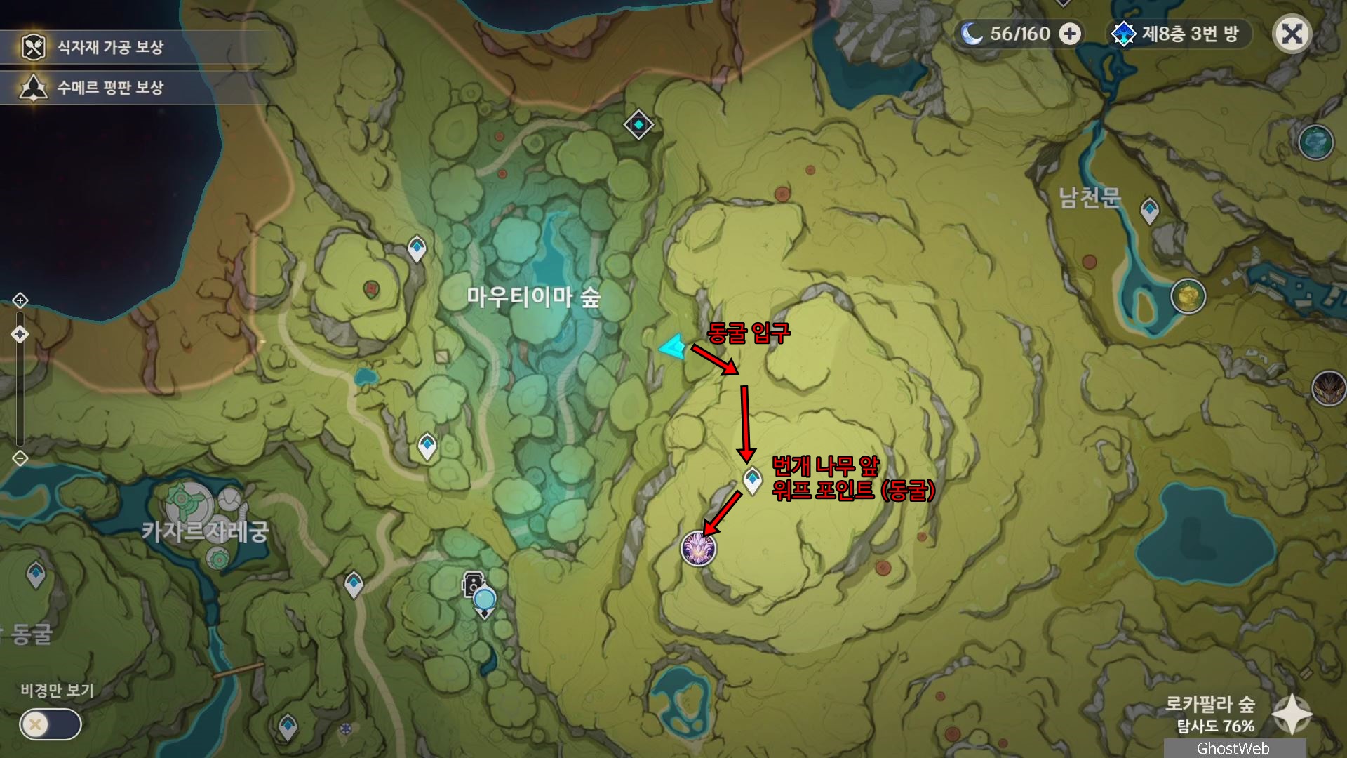 수메르 북동쪽 (수메르 성 기준 1시 방향)에 있는 마우티이마 숲 오른쪽 산 중간에 있는 동굴로 들어가면 워프 포인트와 번개 나무가 있어요.