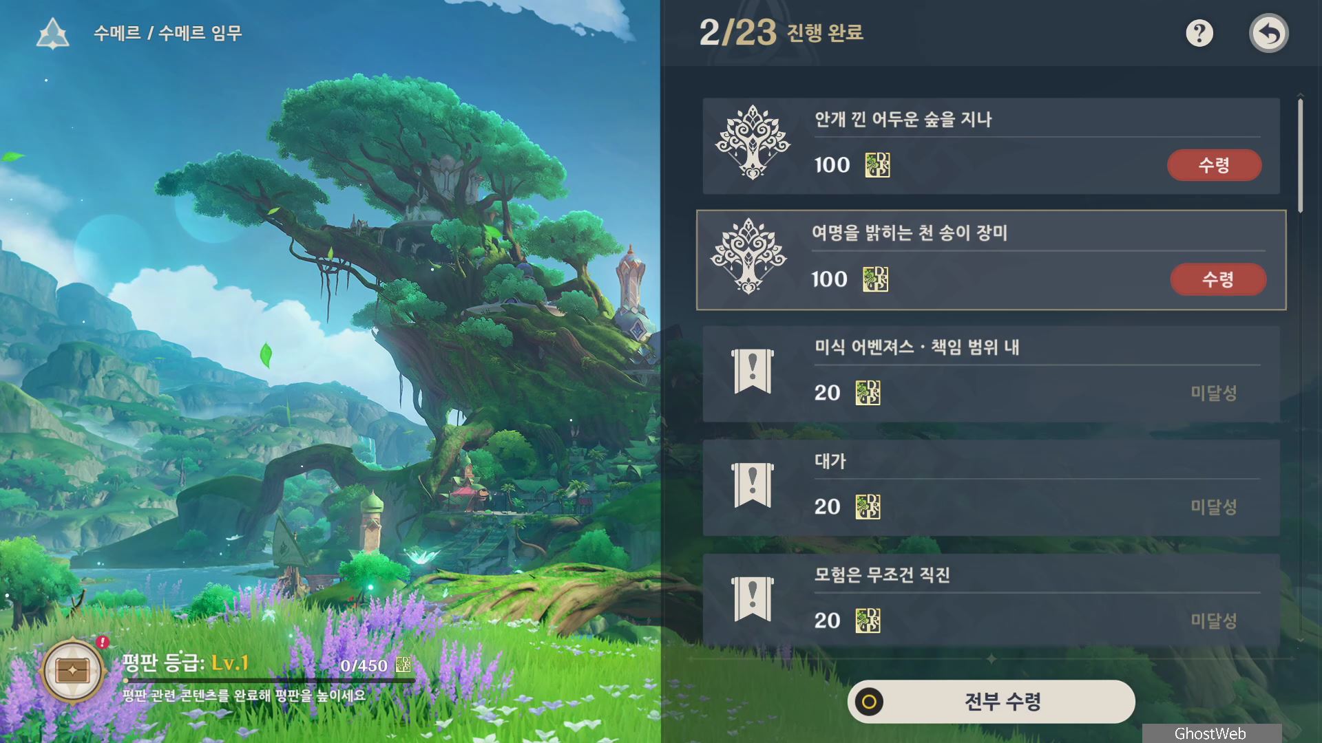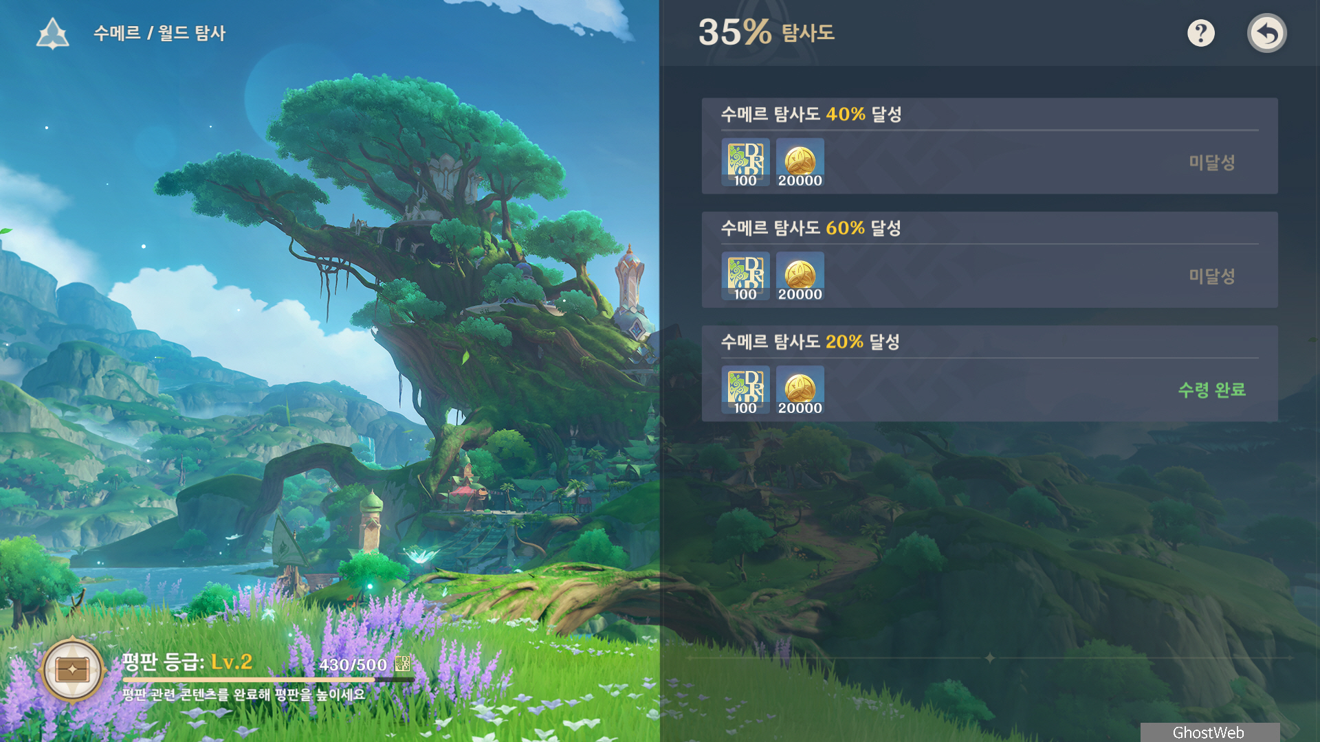 - 수메르 탐사도 20% 달성 (수메르 평판 경험치 100, 20000 모라)