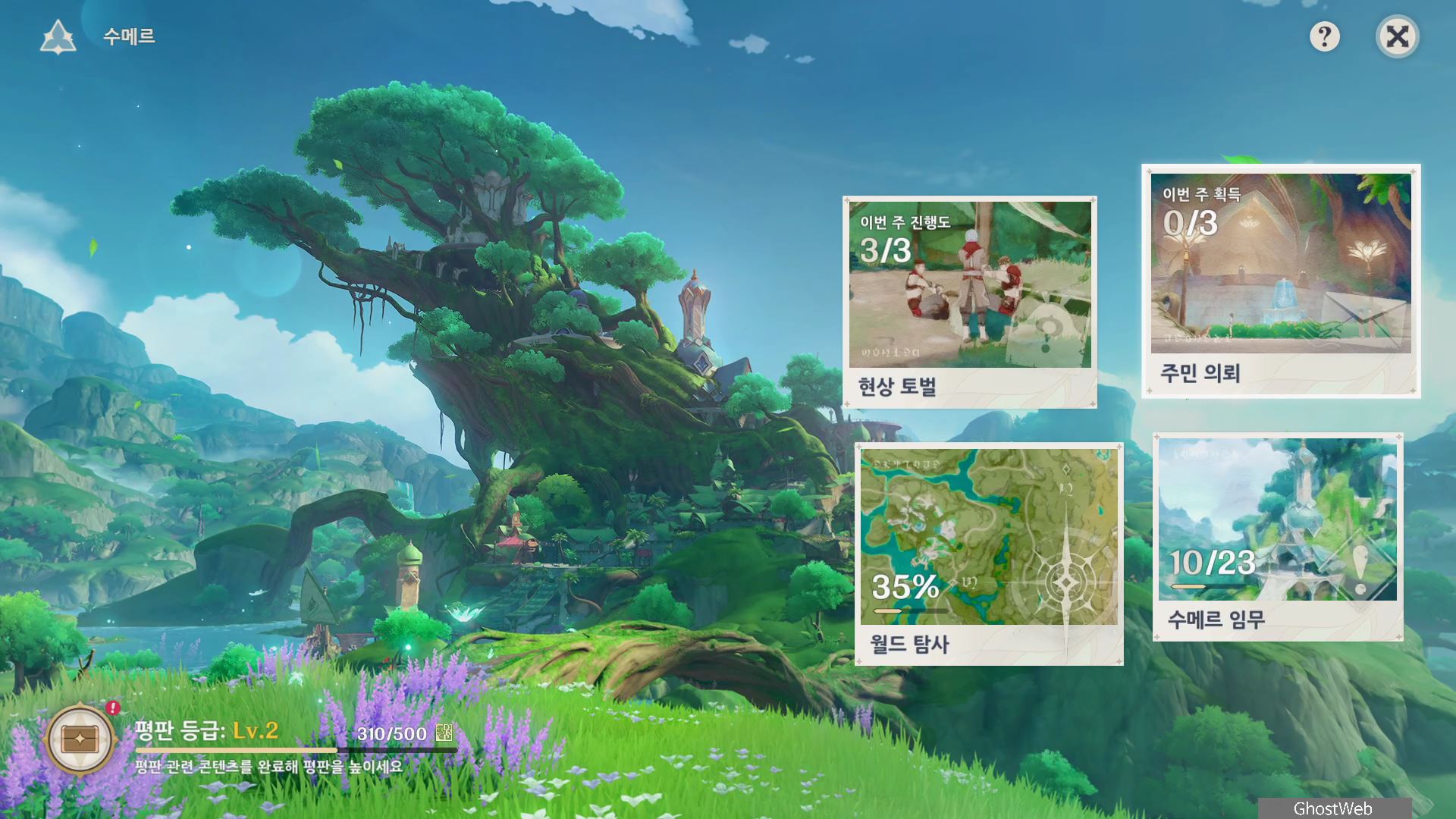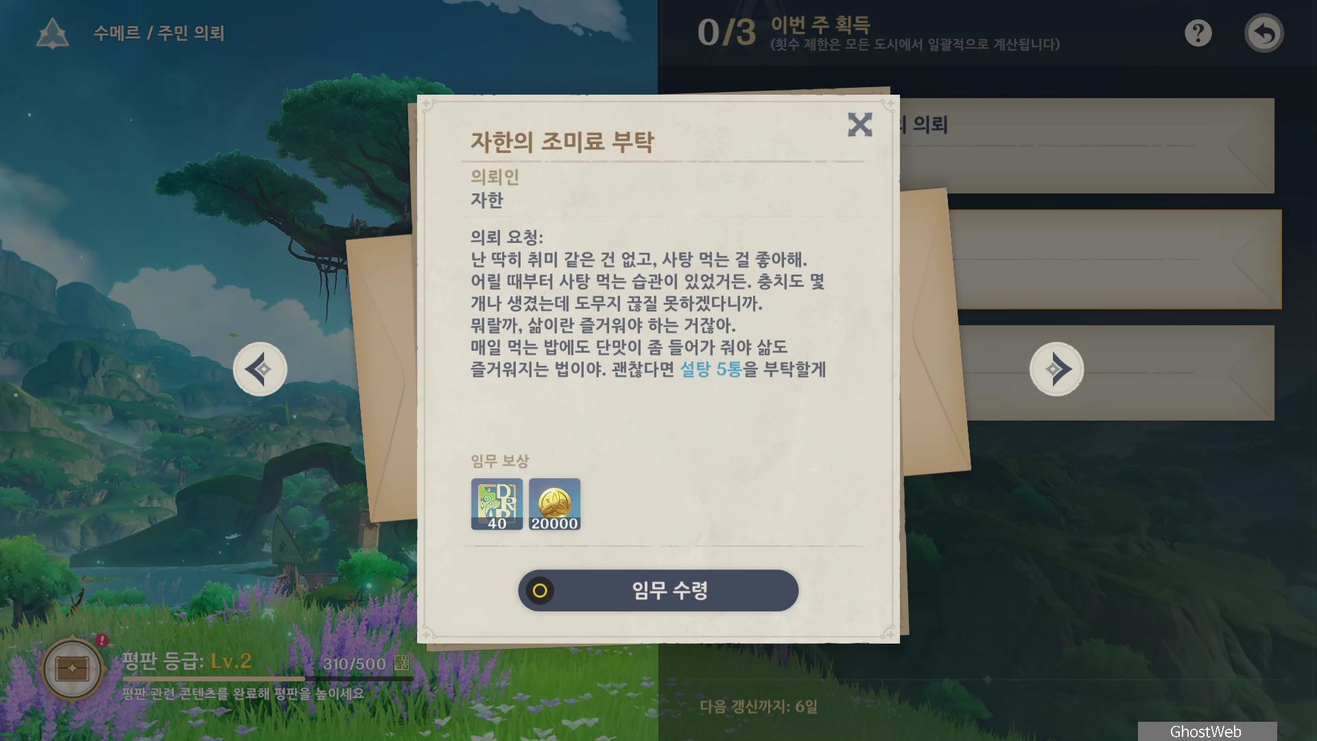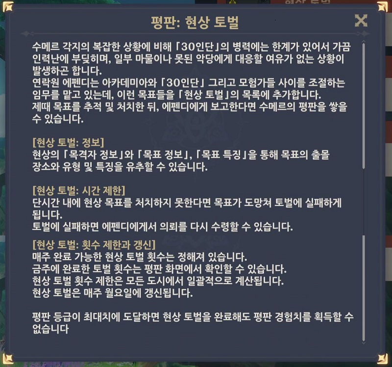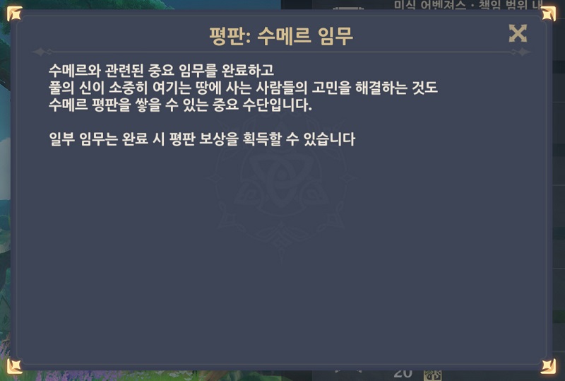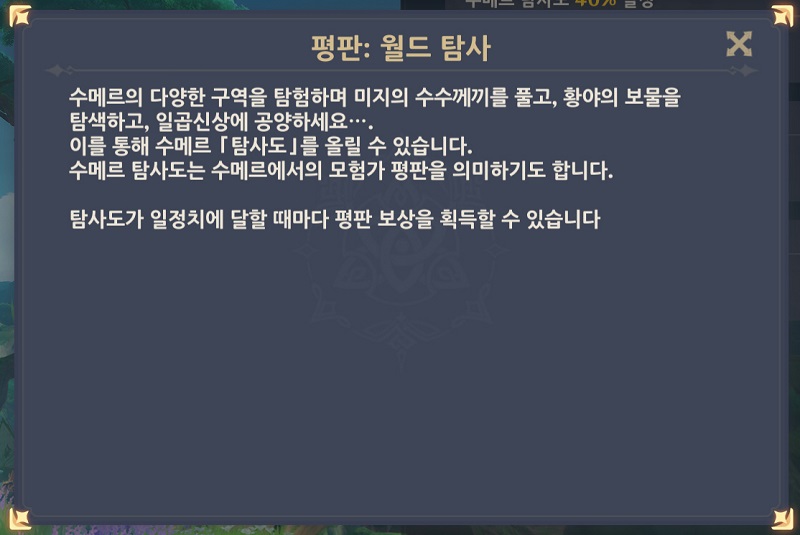 - 수메르 탐사도 40% 달성 (수메르 평판 경험치 100, 20000 모라)