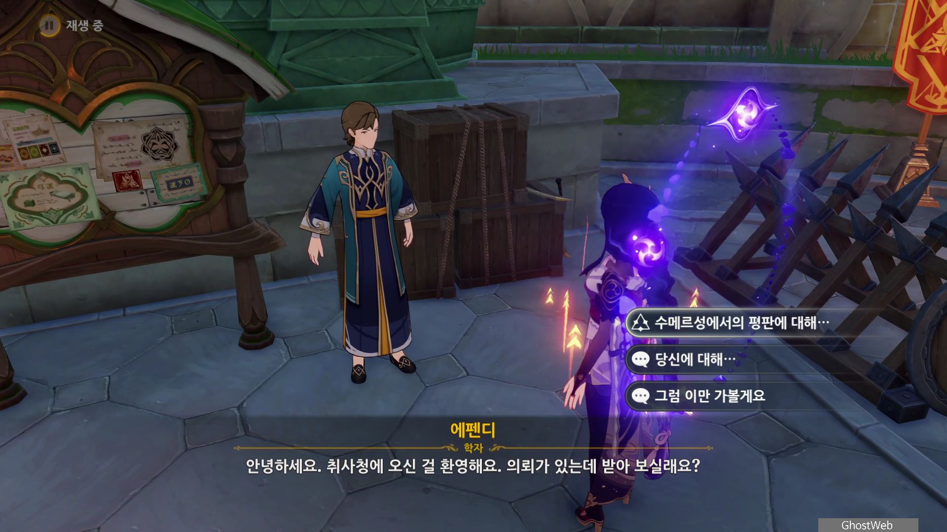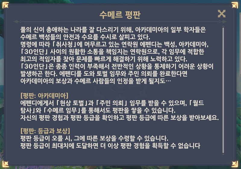 수메르 성 위쪽(취사청)에 있는 에펜디(학자)에게 말을 걸면 수메르 평판 임무 진행과 등급 별 보상을 얻을 수 있어요.