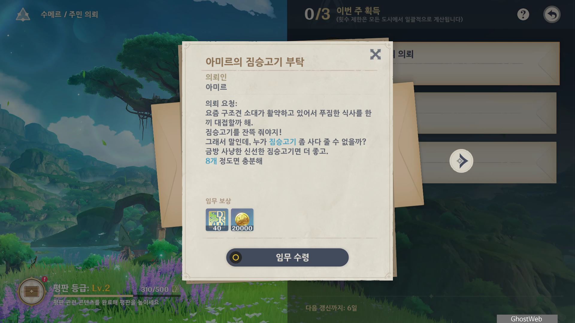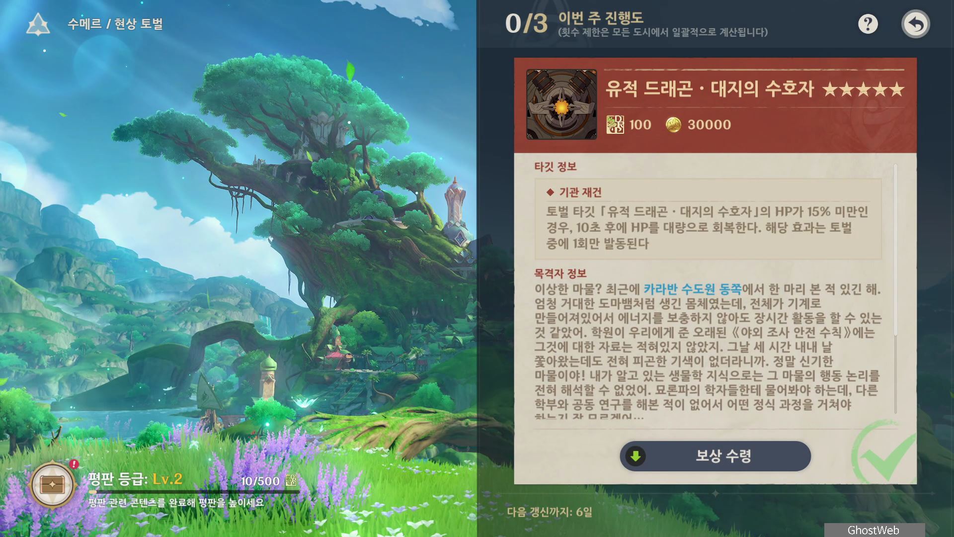 - 수메르 탐사도 60% 달성 (수메르 평판 경험치 100, 20000 모라)