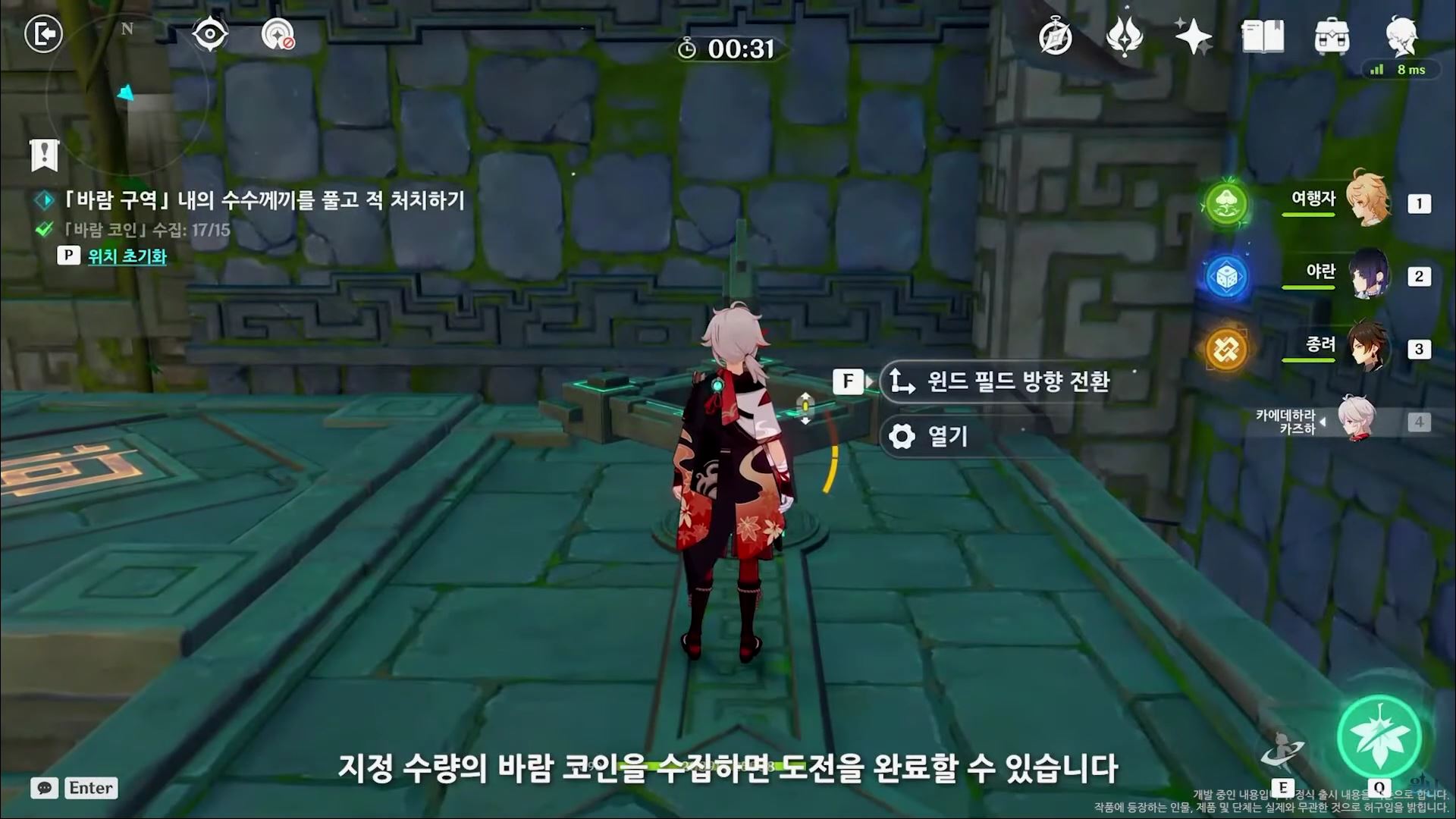 - 기이한 장치를 이용하여 윈드 필드 장애물을 이용하여 비경에 있는 바람 코인 획득, 적 처치하기