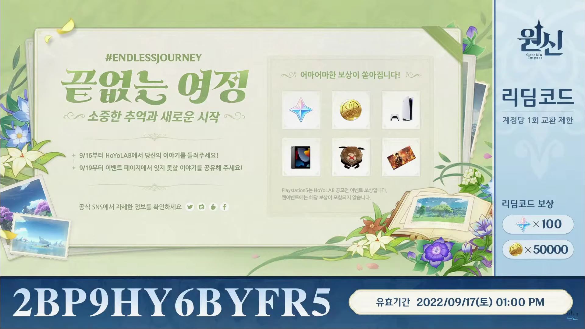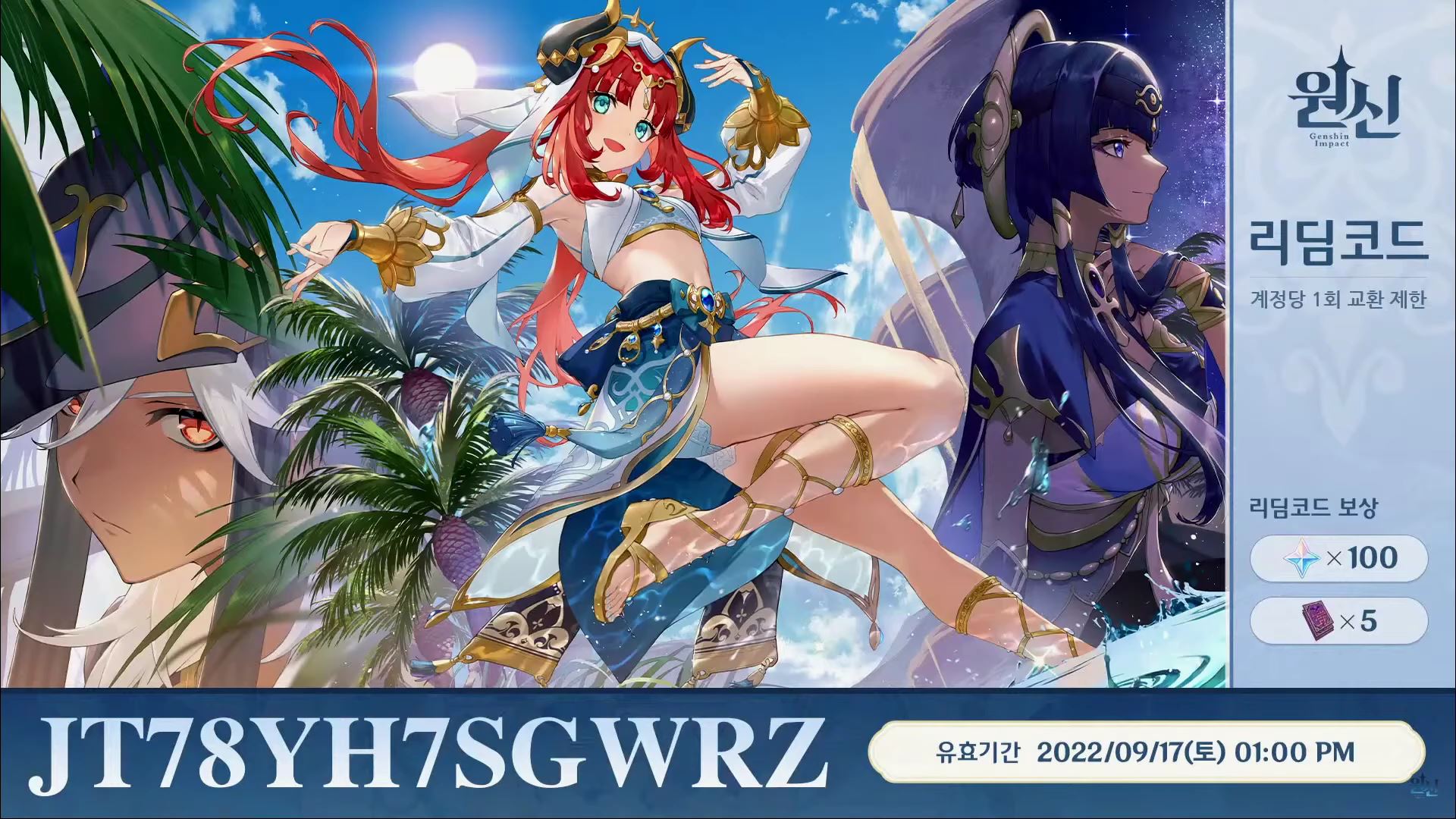 맨 아래 있는 리딤 코드는 9/17 오후 1시까지만 유효하며, 원신 홈페이지에서 리딤 코드를 입력하여 원석 등을 얻을 수 있어요.