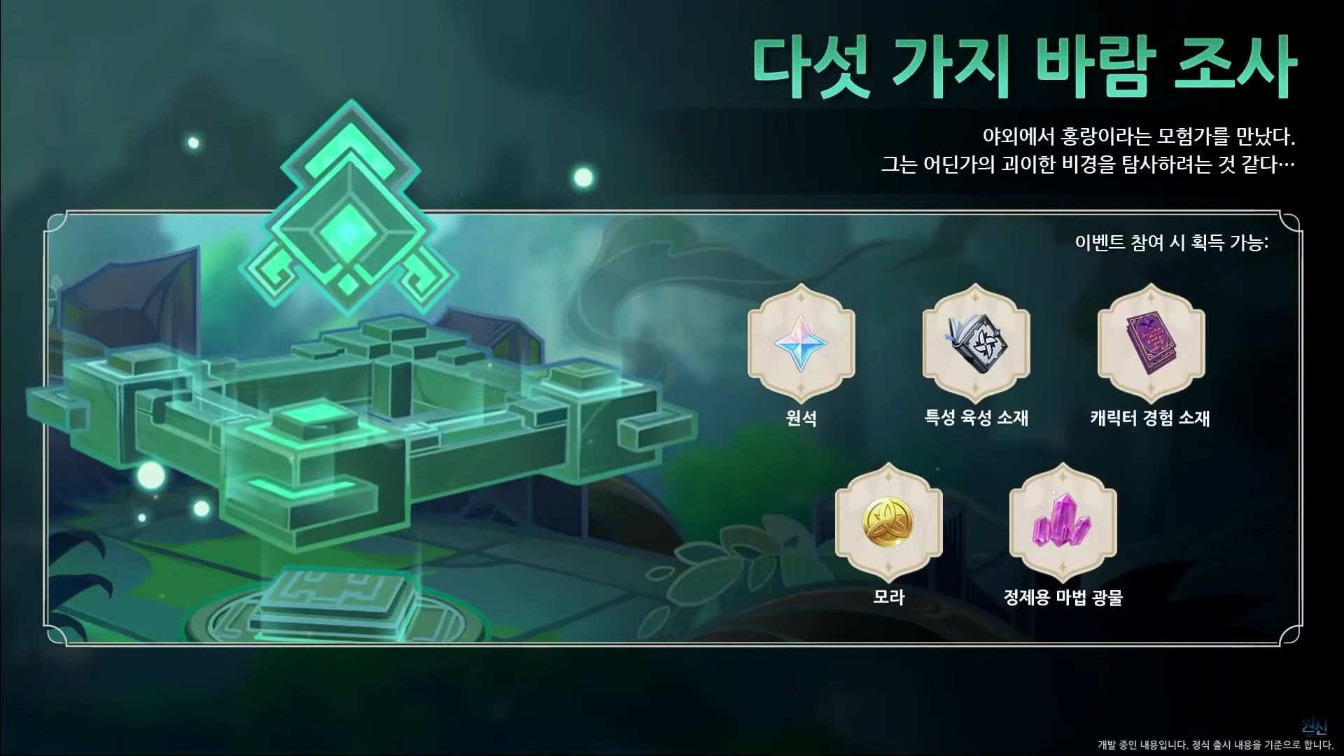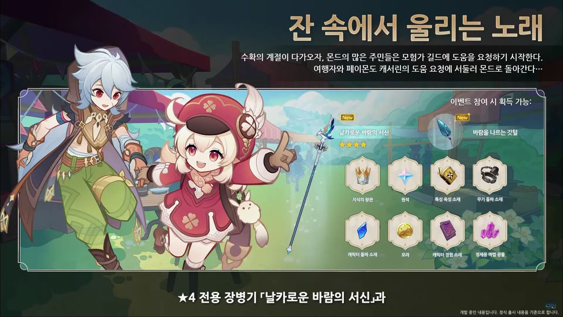 - 보상 : 날카로운 바람의 서신 (4성, 장병기), 원석, 특성 육성 소재, 무기 돌파 소재, 캐릭터 돌파 소재, 모라, 캐릭터 경험 소재, 정제용 마법 광물