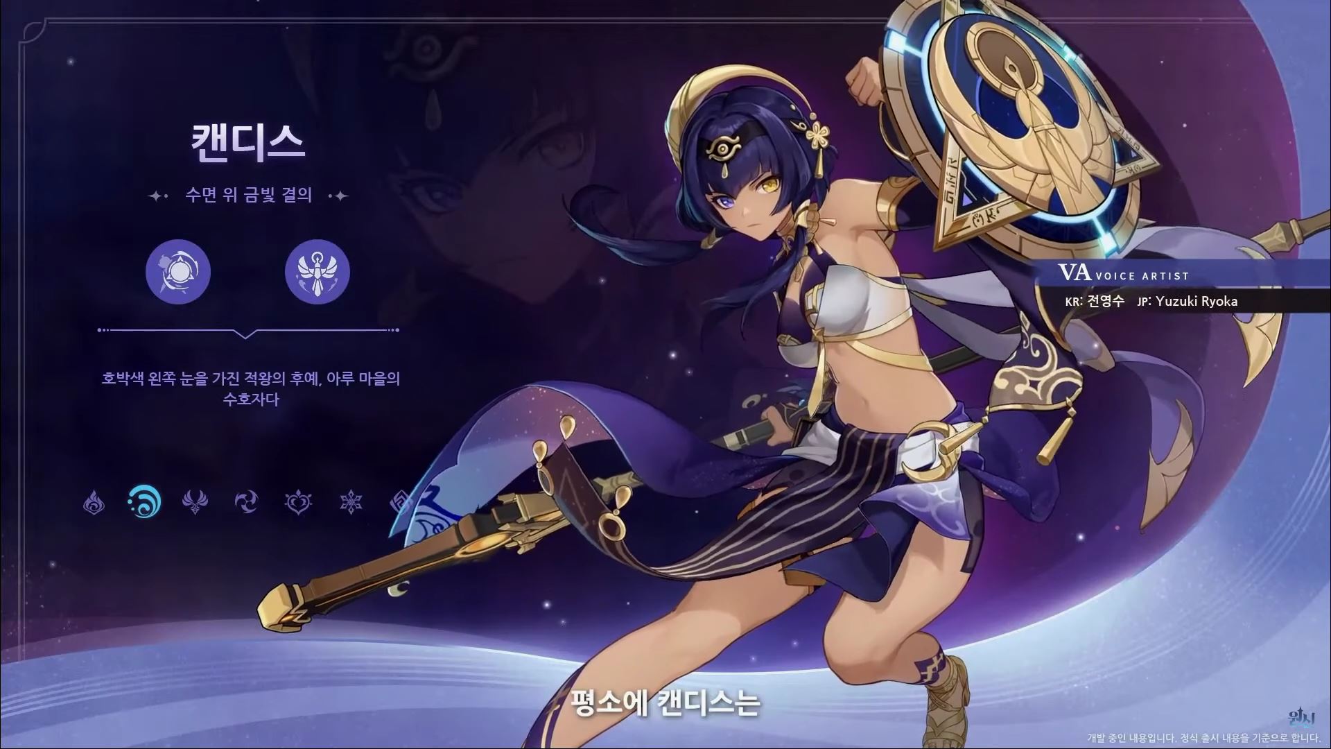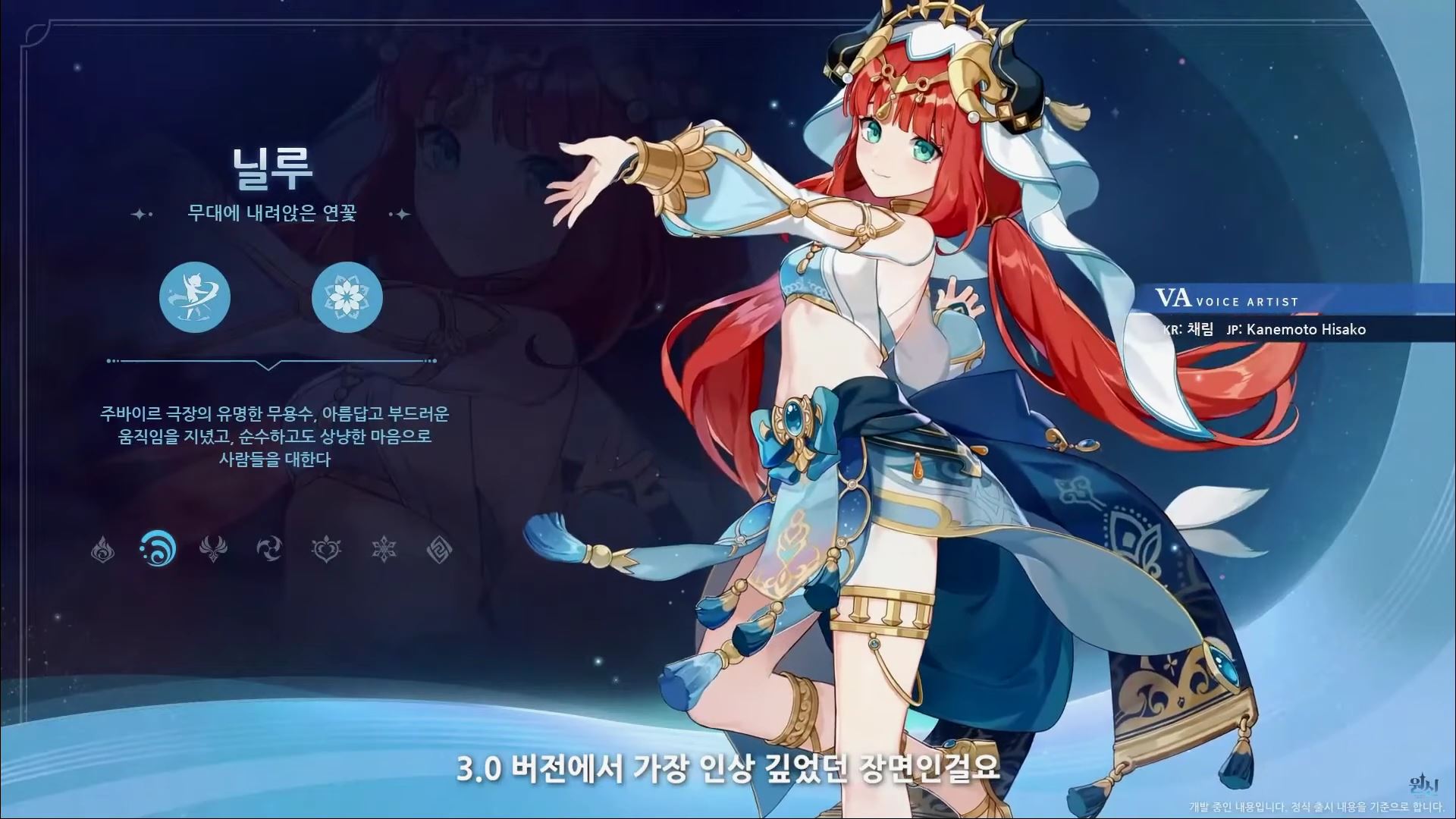 - 만약 3번째 단계 춤에서 다시 원소 전투 스킬을 발동하면 <선희의 춤>으로 전환되고 물 원소 범위 피해를 주며, 현재 자신의 필드 위 캐릭터와 동행하는 물 안개를 생성해 범위 내 적에게 지속적으로 습기 효과를 부여.