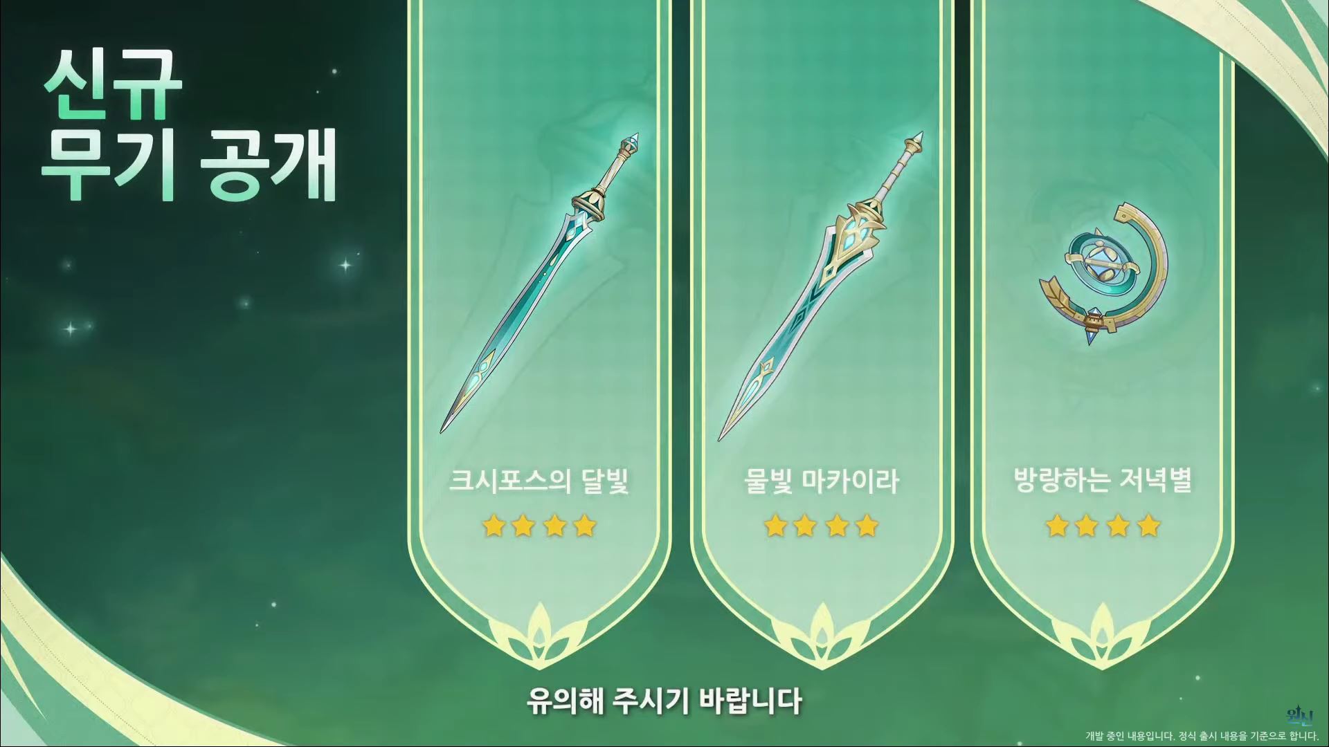 - 한손검, 양손검 및 장병기 캐릭터에겐 물 원소 부여 효과가 추가로 적용되며, 필드 위 캐릭터가 일반 공격으로 가하는 원소 피해가 증가